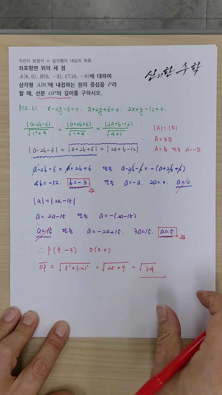안녕하세요? 모두가 힘을 모아 일이 척척 진행되어 신이 나는 신의한수학학원입니다. ^^ 오늘 영상은 고등학교 1학년 2학기 때 배우는 공통수학2에서 직선의 방정식을 이용하여 삼각형의 내심의 좌표를 찾는 문제 풀이 마지막 3편입니다. 첫 번째 등식을 보면 양변에 절댓값이 있습니다. 이런 모양일 때 결론이 'A=B 또는 A=-B'가 되는 것쯤은 다들 알고 있으리라고 믿고 싶어요, 선생님은. ^^;; 정리해 주면 'b=-3 또는 a=0'이라는 결론을 얻게 되는데, 이 때 a=0이 될 수 없는 이유는... 영상에서 설명해 드렸습니다. ^^ 직선의 방정식 ☆ 삼각형의 내심의 좌표 (3편) 두 번째 등식을 정리하면 &....... <img src="https://phinf.pstatic.net/image.nmv/blog_2026_02_12_3914/cQlZSYH4xc_10.jpg?type=f480x480" />