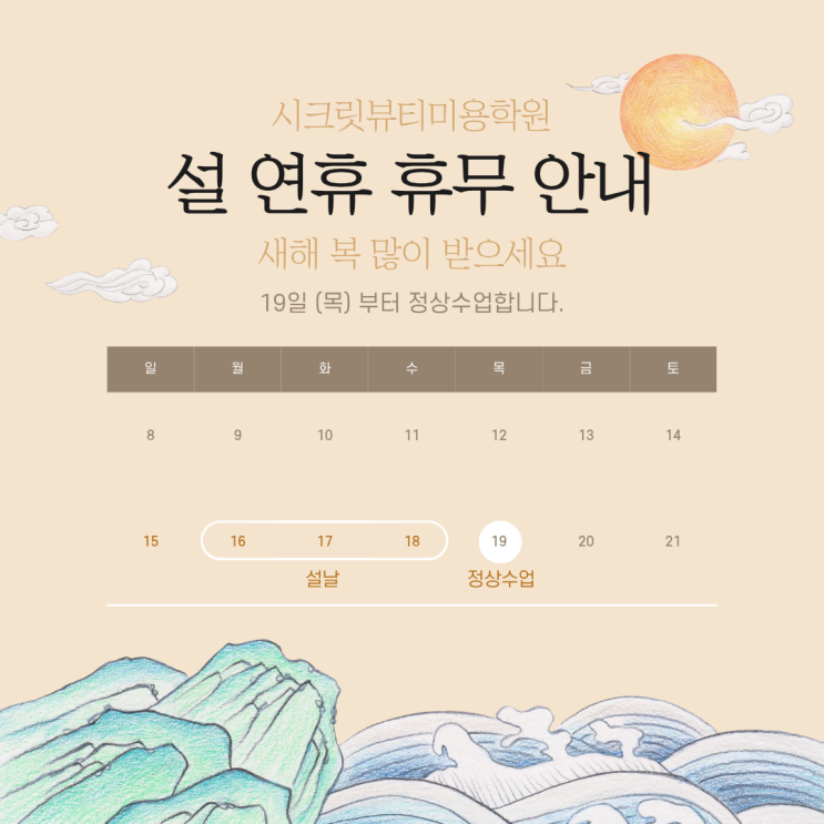 설 연휴 안내‼ 소중한 사람들과 함께 따뜻하고 행복한 명절 보내시길 바랍니다❤ 2월19일 목요일에 만나요 새해 복 많이 받으세요‼ 설 연휴기간에도 상담은 가능하니 언제든지 편하게 문의주세요‼ #구미시크릿뷰티미용학원 #구미미용학원 <img src="https://blogthumb.pstatic.net/MjAyNjAyMTRfMjAw/MDAxNzcxMDI4NjQ4Njkz.xfmGdYJdnUxfnmRDZqdYVTIo8jyeSR_49nEsNna2ZxYg.21Dj4iiFr02uZkwuE_xWBOe7wuM5lK2UQvBUFROgOZEg.PNG/KakaoTalk_20260214_085517825.png?type=s3" />