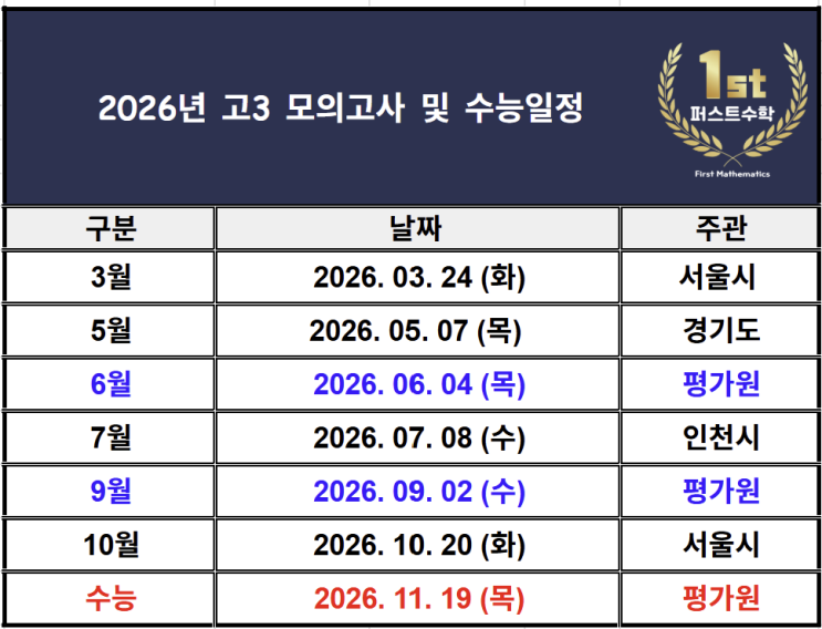 고3이 되면 가장 먼저 확인해야 할 것이 있습니다. 바로 1년 모의고사 일정입니다. 언제 어떤 시험이 있는지 미리 알아야 그에 맞춰 공부 계획을 세울 수 있습니다. 안녕하세요 :) 초,중,고 개별진도 수학 전문 목동퍼스트수학 입니다. 오늘은 2026년 고3 모의고사 전체 일정을 한눈에 정리해드리려고해요. 여기서 질문!!! 학평|모평(평가원) 뭐가 다른가요?? 고3 수험생이라면 반드시 알아야 할 차이입니다. 학평 (전국연합학력평가) 주관: 시·도 교육청 대상: 재학생만 응시 (N수생 없음) 출제: 교육청 (평가원 아님) 특징: 수능 출제 경향과 다소 차이 있음 시기: 3월, 5월, 7월, 10월 모평 (대학수학능력시험 모의평가) 주관: 한국교육과....... <img src="https://blogthumb.pstatic.net/MjAyNjAyMTdfMjA4/MDAxNzcxMzE4NDQxNjk5.oxfZONdXTHRHwv-bKb3sq2takqif45pgWtbsUT72uakg.qAJau8Wgmzp85z4YmKvPcp8hlOC0Jr2ZCJgWGi8U8B8g.PNG/26%B3%E2_%B0%ED3_%B8%F0%C0%C7%B0%ED%BB%E7_%BC%F6%B4%C9%C0%CF%C1%A4_.png?type=s3" />