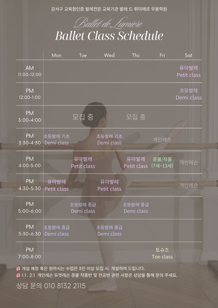 ✨BALLET DE LUMIERE✨ 26년 3월 리뉴얼된 유.초등 발레 시간표 안내입니다 *토요일 초등발레 수강을 원하시는 요청이 많았는데요~ 드디어 발레 드 뤼미에르 토요 1회반 12:00 DEMI CLASS 개설되었습니다~ 강서구 등촌동 가양동 마곡동 발산동 등 토요반 초등발레 수강을 원하시는 분들의 많은 관심 부탁드려요!평일 정규 클라스 친구들 보강도 가능하니, 참고하여 주세요! <img src="https://blogthumb.pstatic.net/MjAyNjAyMThfOTEg/MDAxNzcxMzk0NDAxMTYx.w0xqFnDV_G9M9Ah7KXfR-4JzB8ngsI3YhN8uukQTUIIg.QLjRdBFam9ejKJPDtZqSG96Dv1RNMtfhZaWFlKUsiJYg.JPEG/2.jpg?type=s3" />
