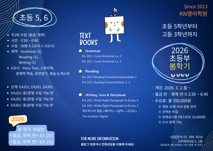 2026 초등부 봄학기 개강 안내 초등 5–6학년, 영어 실력의 방향을 결정하는 시기 초등 5–6학년은 중학교 영어의 출발선이 정해지는 시기입니다. 실제로 서원초 · 원촌초 · 원명초 고학년 아이들을 지도하다 보면, ✔ 문제를 근거를 바탕으로 사고하며 해결했는지 ✔ 문장을 구조로 이해했는지 ✔ 단어를 반복을 통해 오래 기억에 남겼는지 이 차이가 중등 진입 후 그대로 이어집니다. 그래서 2026년 봄학기, 초등부 고학년 영어는 사고 중심의 연결 구조로 운영합니다. 반포영어 KN영어학원 초등부 고학년 프로그램 반포영어 KN영어학원 초등부 고학년 프로그램은 수업 × 활동 × 코칭을 중심으로 설계되어 있습니다. ✔ 실제로 느껴....... <img src="https://blogthumb.pstatic.net/MjAyNjAyMTZfODcg/MDAxNzcxMjIzNzEyMDY2.Gy59ReAwTY_i4I6WpnruM5VX17o33u4k66-M61XYiV8g._t6JNiLHYod4q6whgrBM0n9BWHhBRJt9NGmj6Ulfqisg.PNG/2026._%BA%BD%C7%D0%B1%E2_%C3%CA%B5%EE%BA%CE_01.png?type=s3" />