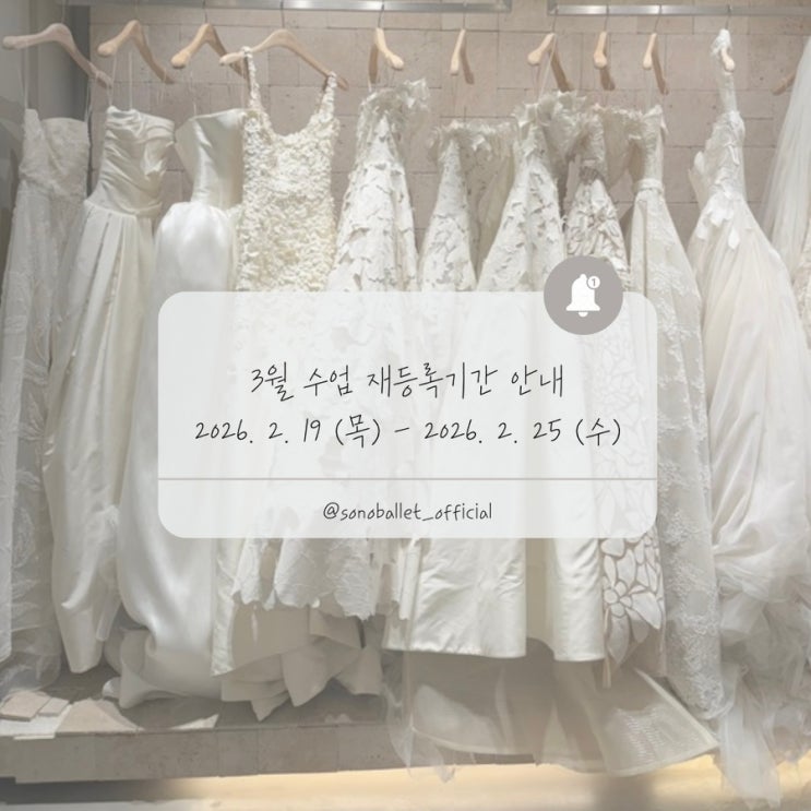 안녕하세요! 소노발레입니다☺️ 3월 수업 등록기간 안내드립니다✨ 매달 3째주는 재등록 기간, 매달 4째주는 신규등록 기간입니다. 재등록 기간 2월 19일 (목요일) ~ 2월 25일 (수요일) 신규등록 기간 2월 26일 (목요일) ~ 3월 2일 (월요일) 재등록 기간에 등록하지 않으실 경우 대기자에게 순번이 넘어갈 수 있으니 늦지 않게 등록 부탁드립니다 혹시 수업 시간 / 요일 변경을 원하시는 분은 미리 말씀 부탁드려요 문의사항 있으시면 언제든 연락 주시고, 곧 3월 스케줄은 보기 쉽게 안내드릴게요 (원하시는 요일/시간 알려주시면 가능 여부 안내드리겠습니다) 감사합니다 • • 발레가 ‘메아리’ (SON....... <img src="https://blogthumb.pstatic.net/MjAyNjAyMjFfMzYg/MDAxNzcxNjgxNTY1Mjk0.so8f14PKra6-VH9sZ2AUrbBOIWyn5CJfnO0817LOX3Ig.qO_NDJZaid1gSgSn_2S-N5GvO0-CvOW-yvrghoCxDL4g.JPEG/IMG%A3%DF1477.jpg?type=s3" />