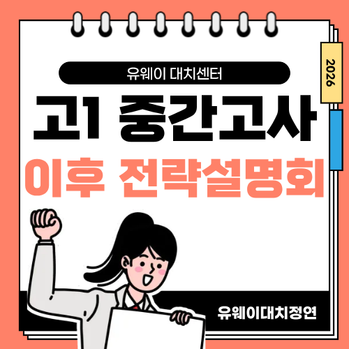 학생은 중간고사 대비! 어머니는 중간고사 이후를 대비! 모두 모두 오세요! “중간고사 이후 학습 & 생기부 전략 설명회” 20년 이상 입시 전문가와 함께하는 유웨이 학습전략 컨설팅과 생기부 컨설팅으로 합격 예약! <<고1 중간고사 이후 대비 전략 설명회>> *일시 : 5월 8일(금) 오후 7시 *장소 : 유웨이 대치센터 (강남구 역삼로417 만수빌딩 5층) *연사 : 박성철 대치센터장, 황도기 컨설턴트 *내용 : 중간고사 이후 고교학점제 입시 대비 맞춤 전략 합격하는 생기부 만들기 비법 특강 *구글폼에서 신청하기 : https://forms.gle/QQg6djox1usp4ac49 <<유웨이 학습전략 컨설팅>> -중간고사 성적을 중심으로 새로....... <img src="https://blogthumb.pstatic.net/MjAyNjA0MjdfMjE2/MDAxNzc3Mjc0MjY0NTYw.OtHrbhYeoMJmCEAdN5AZtzJktyTTtAwn4S7L2ro3UWIg.a-jtNQZ1Y-gHff7KM1YTCso29WPmIdnrDRsu4ErVvI0g.PNG/1.png?type=s3" />