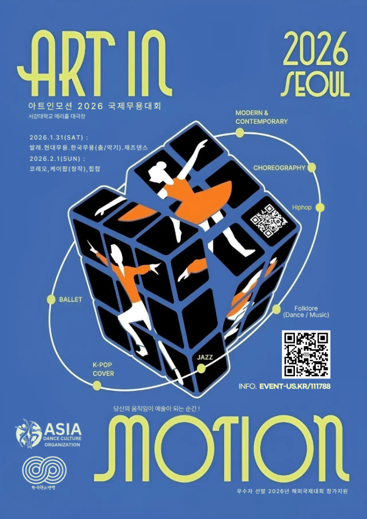 아트인모션 2026 국제무용대회 " 움직임이 예술이 되는 순간" 2026년 1월 31일(토) ~ 2월 1일(일) 서강대학교 메리홀 대극장 (16.3m x 16.3m) 접수: event-us.kr/111788 접수 마감: 2026년 1월 20일(월) 23:00 무대에서 당신의 이야기를 춤으로 전하세요.!! #아트인모션2026 #국제무용대회 #ArtInMotion2026 #댄스페스티벌 #무용대회 #KDance #InternationalDanceCompetition #DancerLife #무용수 #공연예술 #현대무용 #발레 #스트릿댄스 #댄서그램 #DanceCompetition #Choreography #PerformanceArt #Dancer #ArtInSeoul 1시간 <img src="https://blogthumb.pstatic.net/MjAyNTExMjJfMjc2/MDAxNzYzNzg3ODE4MTg2.ST0SiMzUp0LsCBco4bf0hW7KFHHGTZ3hvBVmbfD9ofYg.3h1ksYXXcofkxISqk9Z2sQMl5l441UKW9pgzn-YNak4g.PNG/2.png?type=s3" />