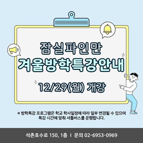 안녕하세요, 잠실파인만입니다. 새 학기 성적은 겨울방학이 결정합니다 ❄️ 겨울 방학은 한 해를 정리하고 다음 학년의 기초를 가장 안정적으로 다질 수 있는 ‘골든타임’입니다. 특히, 2026학년도는 2022 개정 교육과정 반영, 중학교·고등학교 수학 난도 변화, 학생부 중심 평가 강화가 계속되면서 방학 기간의 집중 학습이 더욱 중요한 해가 될 전망입니다. 왜 겨울방학이 중요한가? ヽ(・̑ᴗ・̑)ノ 한 번 놓치면 따라가기 어려운 수학 개념 구조 중등, 고등 수학은 앞 단원 개념이 다음 단원까지 이어지는 ‘계단형 구조’입니다. 겨울 방학 동안 누적 개념의 빈틈을 메우지 않으면 새 학기 첫 단원부터 난이도가 확 높아지는 경....... <img src="https://blogthumb.pstatic.net/MjAyNTExMjVfODAg/MDAxNzY0MDcxNzAxMzU2.iGtSqDtkMkFVV7_MblLgryBrDLSLzcVRlQm0xl5y-r8g.2wLGbSk1Mc_ROvlKiU-WjTn9-YXz5KRwImnKDVZe2Wgg.JPEG/%BD%E6%B3%D7%C0%CF_%B9%E6%C7%D0%C6%AF%B0%AD.jpg?type=s3" />