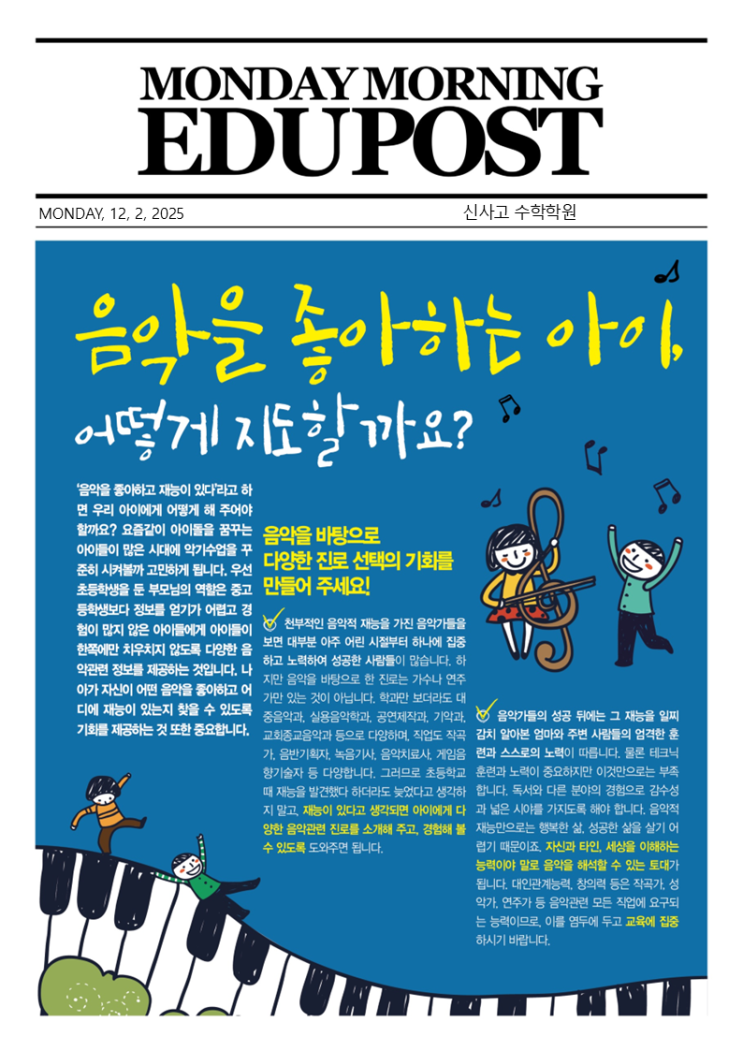 안녕하세요. 위례피아노학원 뮤직애 원장 조재은입니다 어제 저에 대해 귀여운 인터뷰가 있었어요 ㅎㅎㅎ 아이들 학교 숙제였나바요. 선생님의 어릴적 꿈이 뭐였어요? 음... 생각해 보니 저의 꿈은 수학선생님였답니다. 그런데 피아노를 전공하고 유학도 다녀오고 해외에서 연주활동을 하면서 자연스럽게 음악과 수학과의 관계에 대해 관심을 갖게 되었습니다. 어떤 관계가 있을까요? 1. 패턴 감각과 구조적 사고가 강화돼요. 음악은 소리의 패턴, 반복, 변형으로 이루어진 체계적인 구조예요. 피아노를 통해 이러한 규칙들을 관찰하면, 아이의 ‘구조를 읽는 능력’이 크게 향상됩니다. 수학에서 함수의 변화, 도형의 규칙성, 수열의 반복 등을....... <img src="https://blogthumb.pstatic.net/MjAyNTEyMDVfMTAy/MDAxNzY0OTAwMTkxMjk3.XP_am46twlFeN85pR65XUk0vk4pcWkv6WsXcwbFnMgEg.GOERR1Z1pWyGym5ytqVXXqDLekao7ujeKrXhxJKXlUog.JPEG/%BF%A9%C1%F8.jpg?type=s3" />
