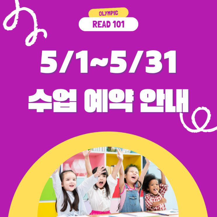 안녕하세요 리드101올림픽점 입니다. 5/1~5/31 예약제 수업시간이 아래와 같이 오픈 될 예정이오니 참고하시어 예약 부탁드립니다. 원활한 수업을 위해 고정예약은 불가능 하오니 학부모님들께서 양해부탁드립니다. 5/1~5/31 학기중 수업 예약안내 평일: 2시/ 3시/ 4시/ 5시/ 6시 토요일: 10시/ 11시/ 12시 ⏰ 평일: 14:00 ~ 20:00 -> 2시/ 3시/ 4시/ 5시/ 6시( 총 5타임 ) ⏰ 토요일: 10:00 ~ 14:00 -> 10시/ 11시/ 12시 (총 3타임) 매주 금요일 오후6시 일주일 단위 예약 OPEN! 5/4~ 5/9 예약은 5/1(금) 오후6시부터가능 --------------------------------------------------------------- 5/11 ~ 5/16 예약은 5/8(금) 오후....... <img src="https://blogthumb.pstatic.net/MjAyNjA0MzBfODgg/MDAxNzc3NTI0MjU5MzQx.ONfSYzC167eRKzejKx_-No3YeaemK8Dsrzj6lBh6ejMg.uw0FkxEfFqjQrKOoIhM2SVDj7GxBLoaNpYnWABOO99Yg.PNG/%BF%C3%B8%B2%C7%C8.png?type=s3" />