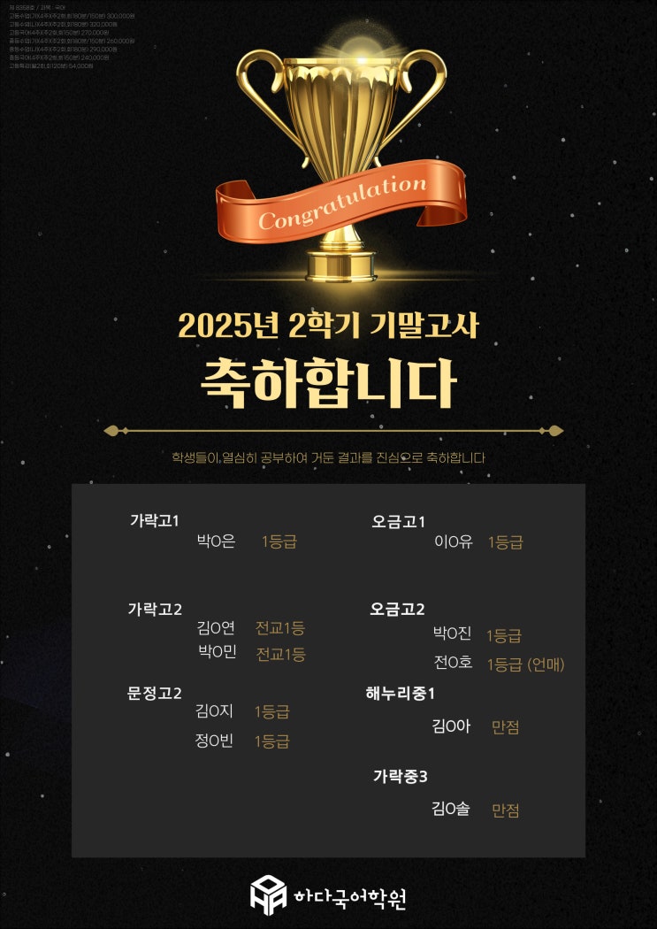[명예의 전당] 2학기 기말고사 국어과목 전교1등 (만점)