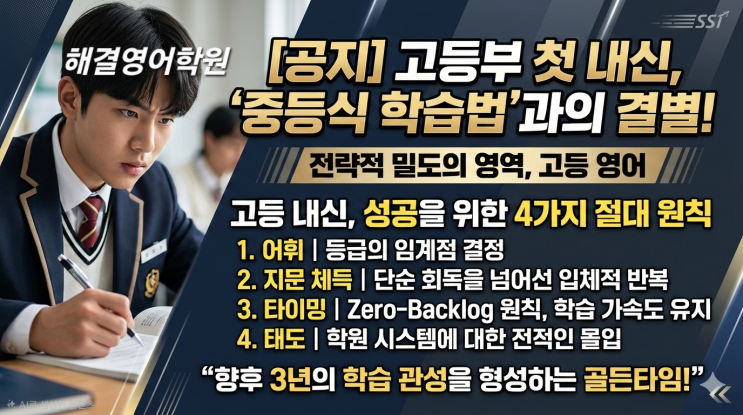 고등부 첫 내신 대비, ‘중등식 학습법’과의 결별이 우선입니다. 안녕하세요, 해결영어학원입니다. 드디어 다음 주부터 고등학교 입학 후 첫 내신 대비가 본격적으로 시작됩니다. 중등시절의 성공 경험은 때로 고등부 성적의 '독'이 되기도 합니다. 고등 내신은 단순히 양으로 밀어붙이는 영역이 아니라, **'전략적 밀도'**의 영역이기 때문입니다. 해결영어학원이 제시하는 고등 영어의 본질을 관통하는 4가지 절대 원칙을 공지합니다. 이 원칙을 수용하는 자는 첫 시험의 승자가 됩니다. 1. 어휘: 등급의 임계점을 결정하는 '절대 변수’ 고등 영어에서 단어는 선택사항이 아닌 기초 공사이자 완공 그 자체입니....... <img src="https://blogthumb.pstatic.net/MjAyNjAzMDhfNzMg/MDAxNzcyOTAwNTIxMTk1.Aw4wznatQEnr6HP59JMeQrA8_Bm0hYUFjv5fwW3xzUMg.B9XgkSHseX5HtHZ4BnYyw5g9r032m9qO0VFIFMenQqYg.PNG/%C7%D8%B0%E1%BF%B5%BE%EE%B0%ED%B5%EE%C3%B9%B3%BB%BD%C5.png?type=s3" />