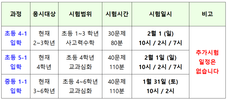 26년 정기 입학시험을 아래와 같이 안내 드립니다. 추가시험이 없으니 일정에 유의해 주시기 바랍니다. ◈ 26년도 2월 입학시험 일정안내 (개강 : 3월 3일) 1. 시험장소 : 생각하는 황소 시흥학원 (배곧3로 80 센터프라자1 - 3층) 2. 신청은 아래 양식에 맞추어 문자로 해 주시기 바랍니다 (010-3245-3336) ☞ 응시과정 / 시간 / 이름 / 학교 / 현재학년 / 보호자연락처 (예시 : 4-1입학 / 3일 2시 / 김황소 / 생각초 / 3학년 / 010-1234-5678) 3. 참고사항 - 응시대상에 해당되지 않으면 응시할 수 없습니다. (부정한 방법으로 합격한 경우 합격이 취소됩니다) - 현재 타지점 재원 중이면 응시할 수 없습니다. - 타지점과 중복 응시한 경우 합격....... <img src="https://blogthumb.pstatic.net/MjAyNTEyMTdfODIg/MDAxNzY1OTUwODE5ODkx.FTfxmVzLbsqiLhsGRQhwOgvHR0Co50c2FP5iTR4zqygg.43DKCD4ZnDw5x8OzZs8wRqOOiQxEXPm7bYRcEJUD2UUg.PNG/image.png?type=s3" />