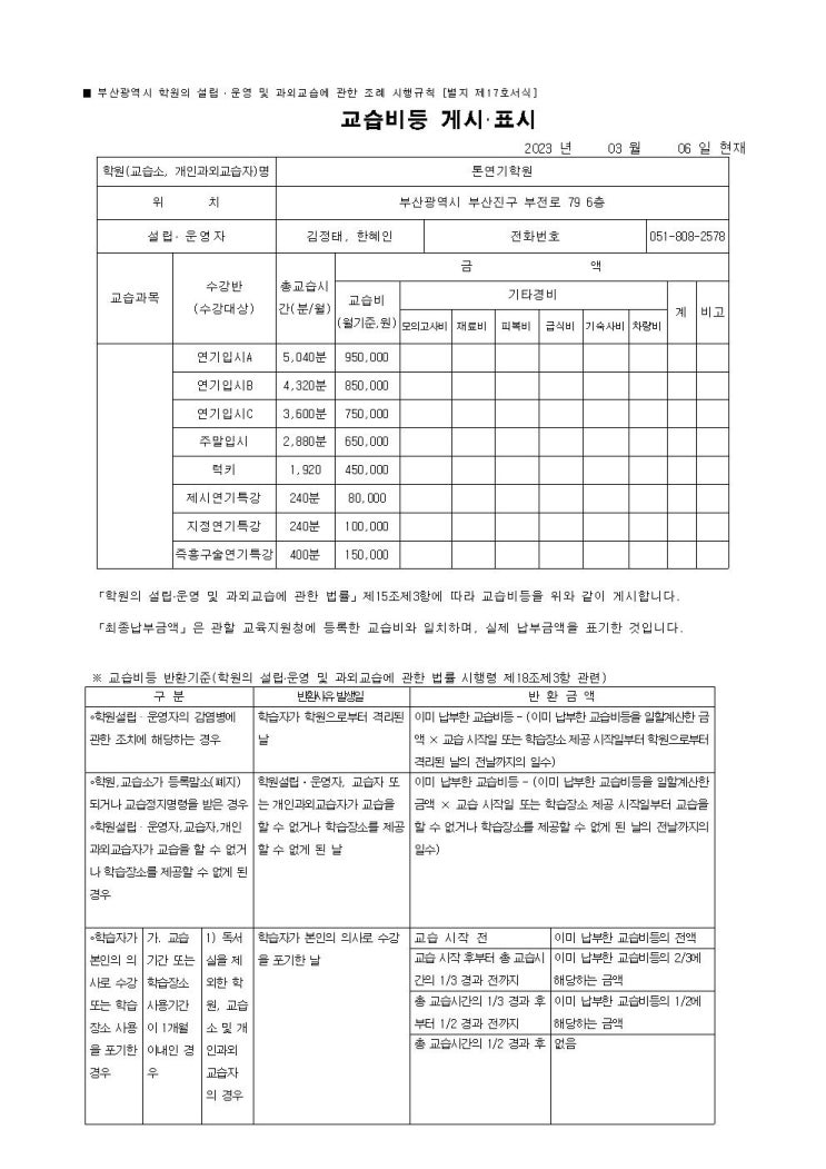 [부산연기학원]교습비등 게시/표시