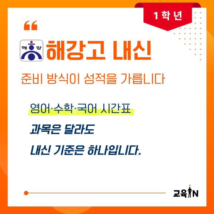 해강고 내신 구조에 맞춰 설계된 국영수 수업 한눈에 정리! 및 과목별 내신 기준부터 준비 순서까지 지금 확인해야 할 포인트! 해강고 학부모님들과 상담을 하다 보면 초반에 꼭 나오는 말이 있는데요. “해강고 시험이 그렇게 어렵다던데요?” “수학이 특히 많이 힘들다던데 맞나요?” 이 질문에 대해 막연하게 어렵다고만 말하는 건 의미가 없답니다. 그래서 오늘은 실제 시험 데이터를 기준으로 해강고 내신이 어떤 구조인지 그리고 그 구조에 맞춰 교육인이 어떻게 수업을 설계했는지를 차분히 정리해보려고 합니다. 해강고 내신, ‘공부를 안 해서’ 무너지는 구조가 아닙니다 먼저 분명히 짚고 가야 할 게 있는데요. 해강고에서 성적이 흔....... <img src="https://blogthumb.pstatic.net/MjAyNjAxMjdfMTk0/MDAxNzY5NTAyNTI3NzM0.Di6Cj4nT2u-NSvXmwPXcNm7b9ZU0XzoSOCnn6R51gTMg.oAYvYorVRCKk2BOA5CgyuvtWz_mdvzK3Q6h1PoRMRtcg.JPEG/001.jpg?type=s3" />
