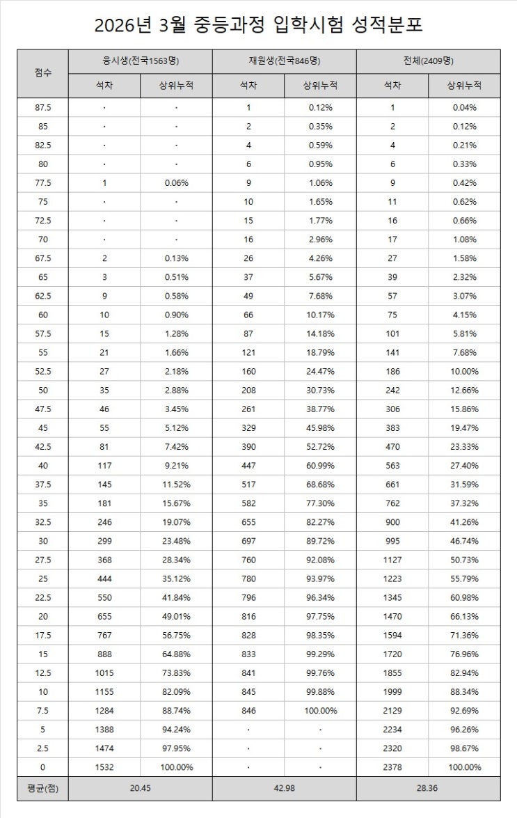 2026년 3월 중등과정 입학시험 성적분포