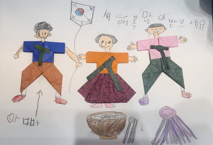가장 간단한 기본 의자 접기를 활용한 저고리 바지 색종이 접기입니다. 치마접기도 가장 간단한 걸로 했습니다. 사각 주머니접기 후에 앞쪽 치마 주름만 잡아 줍니다. 조금 더 어려운 단계로 가위질을 해야하는 것은 달력 만들기에 만들어 붙였습니다. 한복 종이 접기를 도화지에 붙인 후, 얼굴 손과 발을 그려넣었습니다. 명절에 할 놀이도 그려넣습니다. 아빠랑은 연날리기, 엄마랑은 떡국 먹기, 나는 재기차기를 한답니다. 아주 고상한 한지색 배색으로 한복을 만들었네요^^ 즐거운 명절 연휴 되시길 바랍니다. 2026년 3월부터 레츠그릿미술놀이학원 새로운 커리큘럼이 생깁니다. 초등학교 2학년부터 6학년까지 그림일기반을 신설하여 운영합....... <img src="https://blogthumb.pstatic.net/MjAyNjAyMTFfMjM5/MDAxNzcwNzg5NDI2MDU1.9GjxtVG6-PWB71iAvPSHRbs7ocEu7R1M3VeQqS-lWNIg.zXR60ccF7CeDqJVWnCOqcxLjIG4tT36ygCAfvlYGY4Yg.JPEG/KakaoTalk_20260211_145319747_03.jpg?type=s3" />