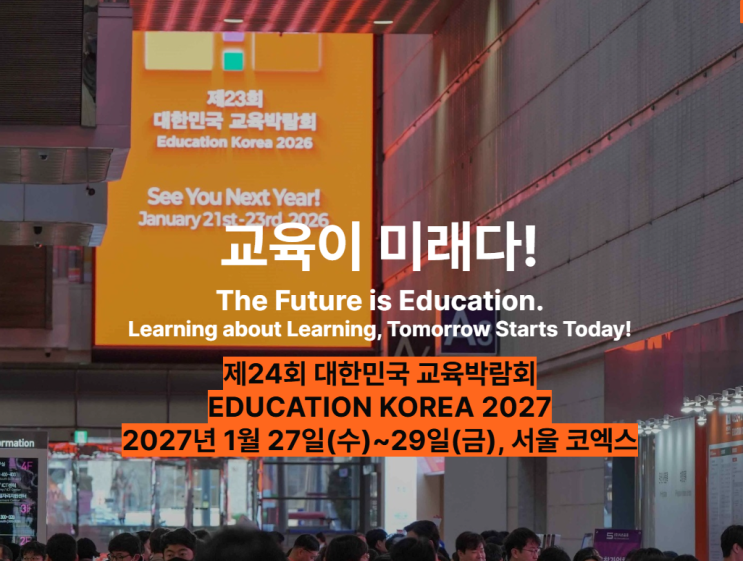 아시아 최대 규모의 교육·에듀테크 행사 '배움을 배우는 오늘, 내일을 시작하는 우리' 역대 최대 규모 '제23회 대한민국 교육박람회'가 2026년 1월 21일부터 23일까지 3일간 진행되었습니다. 제24회는 대한민국 교육 박람회는 2027년 1월 27~29일 이라고 합니다. 이미지 출처: 대한민국 교육박람회 공식 홈페이지 (https://www.educationkorea.kr/) 서울 코엑스에서 22개국 592개 기업 및 기관이 참여 인공지능(AI)을 넘어 범용인공지능(AGI) 시대로 변화하는 교육 환경과 대응 방안을 이야기 하는 박람회 였습니다. 참여 기업 및 전시 내용 엘리스그룹, 프리윌린 등 맞춤형 AI 코스웨어와 학습경험플랫폼 등 지속 가능한 AI....... <img src="https://blogthumb.pstatic.net/MjAyNjAzMDJfMzQg/MDAxNzcyMzk3OTQyNzk1.vwM2_WNxaOZ2LRiQy0VfRtrVcPsAp7w81RvvoDAc_Ekg.oJqEWSmUPTXWQJd293oYigQ4RBKmN7Dlqxip0doJUQ8g.PNG/image.png?type=s3" />