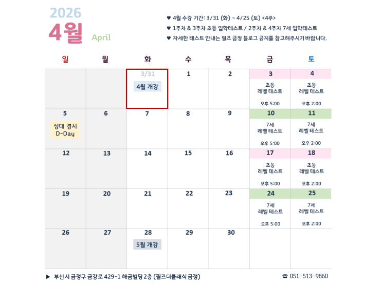 필즈 금정 <26년 4월> 일정 및 입학 테스트 예약 안내