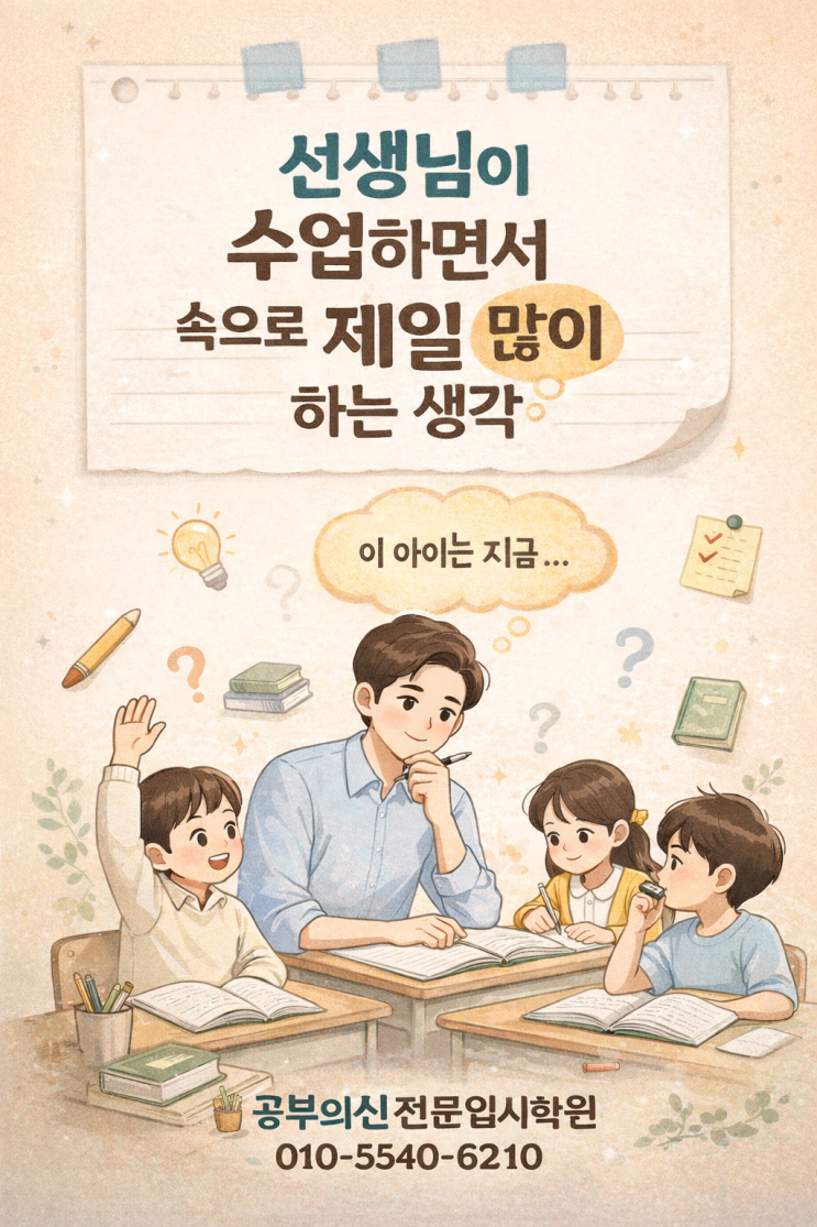 수업을 하다 보면 아이들 앞에서는 연필을 들고 차분하게 설명하고 있지만, 솔직히 말하면 속으로는 계속 생각이 돌아갑니다. 마치 운전할 때 겉으로는 핸들만 잡고 있지만 머릿속에서는 ‘여기서 차선 바꿔야 하나’, ‘속도 너무 빠른가?’ 이런 판단을 계속하는 것처럼요. 공부도 똑같습니다. 문제를 풀고 있는 아이를 보면서 선생님들은 늘 이렇게 생각합니다. “지금 이 방향… 맞나?” “다 아는데 실수했어요”라는 말을 들을 때 학원에서 정말 자주 듣는 말입니다. 초등학생도, 중학생도, 고등학생도 다 똑같이 말합니다. 그런데 선생님 입장에서는 이 말이 마치 이런 말처럼 들릴 때가 많습니다. “길은 아는데, 왜 자꾸 다른 데로 가는....... <img src="https://blogthumb.pstatic.net/MjAyNjAxMjlfMTQy/MDAxNzY5Njg3MjAwNDMz.ZvMCbLTlydwVahJn-2O9NBh3BRZ55IY8AOHKC2X2ZzQg.br800hWJwS3LamVkwFIiFJQkhfvl0_vjfyxFktN5oiYg.PNG/ChatGPT_Image_2026%B3%E2_1%BF%F9_29%C0%CF_%BF%C0%C8%C4_08_46_23.png?type=s3" />