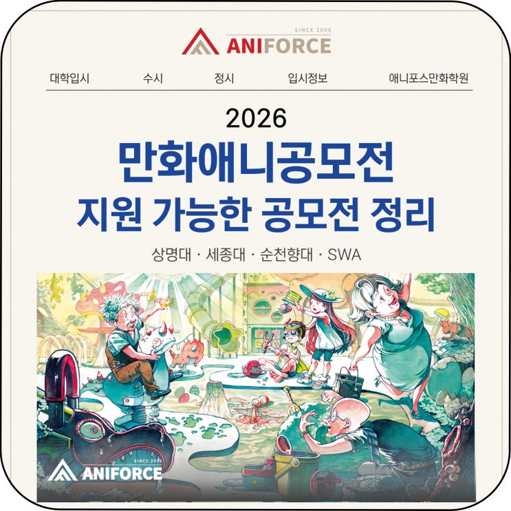 안녕하세요! 수성 애니포스 만화학원입니다. 2026년 만화애니메이션 공모전이 한창 진행되고 있습니다. 현재 지원 가능한 만화애니 공모전을 소개해드릴게요. 1. 2026 상명대 공모전 * 접수기간 : 2026.03.19.(목) 10:00 ~ 05.01(금) 17:00 * 응모 분야 : - 만화 : 카툰, 카만화, 극만화, 웹툰 - 애니메이션 : 상황표현, 단편애니메이션, 스토리보드, AI 쇼츠 - 콘텐츠 : 일러스트레이션, 캐릭터, 게임컨셉아트(캐릭터 컨셉 아트, 배경 컨셉 아트), 포스터, AI 일러스트레이션 * 수상자 발표 : 2026.05.25.(월) 2. 2026 세종대 공모전 * 접수기간 : 2026.03.31(화) 00:00 ~ 05.01(금) 24:00 ※ 전체 1,600명 선착순 모집으로 인원이 조기 마감될....... <img src="https://blogthumb.pstatic.net/MjAyNjA0MjRfMjE1/MDAxNzc3MDMxODIwNDEx.MQu91QhIZyzVdMlgSbpW6Br5BAREnhLF-w_QmxEzI0kg.9S00mw2Q8xES5wFUQMRvk6K103a0EzoJX_sr_-r6g3Eg.JPEG/%B9%AB%C1%F6_%BD%E6%B3%D7%C0%CF_%281%29.jpg?type=s3" />