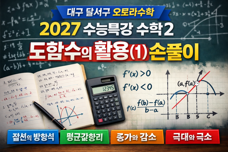 대구 달서구 오르라수학 2027 수능특강 수학2 도함수의 활용(1) 손풀이 안녕하세요. 대구 달서구 유천동 진천동에서 수학을 제대로 가르치는 오르라수학전문학원입니다. 이번에 정리한 내용은 대구 달서구 오르라수학 2027 수능특강 수학2 도함수의활용(1) 손풀이입니다. 도함수의 활용(1)은 수능에서 단순 계산 문제가 아니라 해석 + 논리 + 응용을 묻는 단원입니다. 그래서 저희는 반드시 손풀이로 직접 전개 과정까지 보여주며 수업합니다. 1. 접선의 방정식 – 도함수의 시작 접선 문제는 도함수 활용의 기본입니다. 핵심 개념은 단 하나입니다. 접선의 기울기 = f'(a) 접점은 (a, f(a)) 공식은 y - f(a) = f'(a)(x - a)....... <img src="https://blogthumb.pstatic.net/MjAyNjAyMTlfMTg2/MDAxNzcxNTExNzczMTc2.nVLC7b2AEjcjJ8234pqvnKYSwIJnqNz7zg5j61rjRV0g.3s34LzyxvEfXL4zTBBfGhrl6_mreHKWiRZjiqqemtAcg.PNG/ChatGPT_Image_2026%B3%E2_2%BF%F9_19%C0%CF_%BF%C0%C8%C4_11_35_55.png?type=s3" />