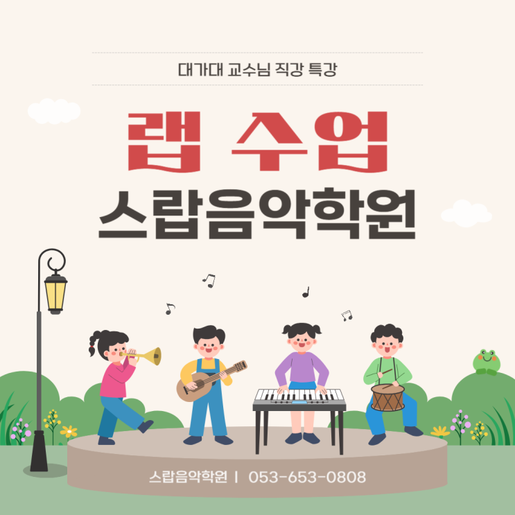 안녕하세요 달서구 성당동 스랍음악학원입니다 이번에 스랍음악학원에서는 조금 특별한 랩 수업 특강이 진행되었습니다 바로 대가대 교수님이 직접 출강하여 진행하는 자기표현 중심 랩 특강 수업입니다 단순한 랩 수업이 아닌 ‘표현 수업’ 달서구 성당동 스랍음악학원에서는 랩을 단순한 기술이 아니라 생각을 정리하고 표현하는 과정 으로 바라보고 있습니다 자기표현과 글쓰기 중심 수업 이번 특강에서는 ✔ 자신의 생각을 글로 정리하기 ✔ 감정을 언어로 표현하기 ✔ 리듬 위에 자신의 이야기를 담기 이 과정을 중심으로 수업이 진행됩니다 단순히 따라 하는 것이 아니라 학생 스스로 생각하고 만들어가는 수업....... <img src="https://blogthumb.pstatic.net/MjAyNjAzMzFfNTkg/MDAxNzc0OTM3NDM4Mzc1.dNRpnhWX0n_Xy_xHSNdsmwGPRoyrZgMItVwSEbVtnoMg.Uzh7LU3buMNQ9XE5Z1PXtxu5jpUMypxXgxE21lnKePAg.PNG/%C1%A6%B8%F1%C0%BB_%C0%D4%B7%C2%C7%D8%C1%D6%BC%BC%BF%E4_-025_%283%29.png?type=s3" />