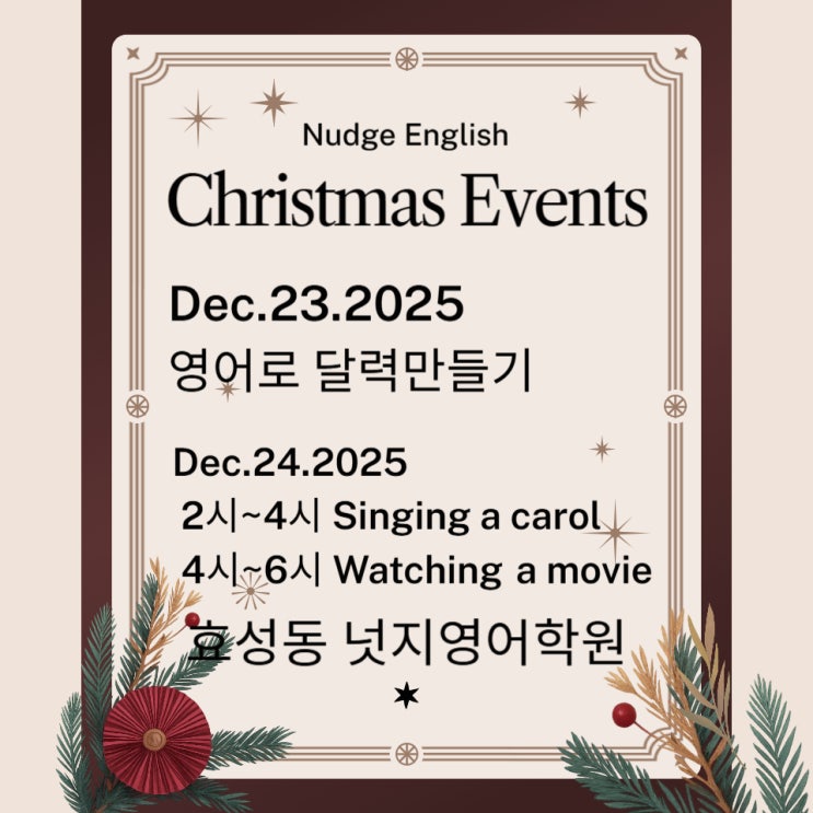 안녕하세요! 계양구 효성동 영어학원 넛지영어 Joy T입니다. 아직 고등부 시험이 끝나지 않아서 바쁜 와중에 크리스마스준비를 하느라 크리스마스행사 소식이 늦어졌어요. 인천효성초등학교와 부설초, 효성동초, 명현초 등 학교들이 대부분 12월31~1월 첫주 방학을 해요. 그리고 우리 넛지영어도 곧 연휴를 맞이하니 빠르게 행사를 준비해야했어요. 넛지영어학원에서 격년으로 행사하고 있는 달력만들기와 크리스마스캐롤을 배워보려고 이틀에 걸쳐 할 예정이랍니다. ※효성동 넛지영어 크리스마스※ ●2025년 12월 23일 화요일 - 영어로 달력만들기 ●2025년 12월 24일 수요일 2시-4시: 크리스마스 캐롤 부르기 4시-6시: 영화관람 영어달력만들....... <img src="https://blogthumb.pstatic.net/MjAyNTEyMTlfMTkg/MDAxNzY2MTA5NjY5MjYx.zhxD-MbB-kr5WoidiV-kRAjAMHx8GN8DAlByDggumYYg.nvVBHo7CjjD-fMEO2pvZF45ONtA2Ee7JObBJaUKA2qQg.JPEG/%C1%A6%B8%F1%C0%BB_%C0%D4%B7%C2%C7%D8%C1%D6%BC%BC%BF%E4_-001_%287%29.jpg?type=s3" />