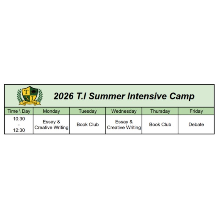국제 학교 여름 캠프 공지 ️ 스케줄 ️ ▪️모든 수업 시간 동일 10시 00분 ~ 12시 00분 ️Session 1 : 6/8 - 6/19 ️Session 2 : 6/22 - 7/3 ️Session 3 : 7/6 -7/17 ▪️대상 Grade 1 ~ Grade 6 ▪️Essay & Creative Writing 주 2회, 2시간, 월요일,수요일 ▪️ Book Club 주2회, 2시간, 화요일, 목요일 ▪️ Debate Club 주1회, 2시간, 금요일 책을 단순히 ‘읽는 것’에서 멈추지 않고, 그 너머의 문학적 장치와 철학적 의미를 발견하는 시간! 학생들의 사고력을 확장하는 T.I 영재영어학원만의 특별한 북클럽 커리큘럼을 소개합니다. G1 & G2: 이야기 속 숨은 장치를 발견하다 저학년 시기에는 풍....... <img src="https://blogthumb.pstatic.net/MjAyNjA0MjRfMjc5/MDAxNzc2OTk0ODExNzg0.g6GDrLH9fta3R2Elpl7oEqfkvyfaPsLJmM0k1cMIXpQg.wkw6KVM3PqIWfkoVxzq552qTGDtQ9sng3w1wMmLDCJgg.JPEG/900_InShot_20260424_103105182.jpg?type=s3" />