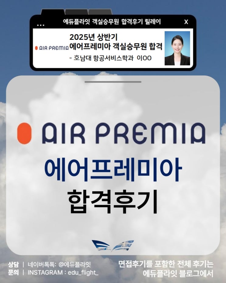 2025년 상반기 에어프레미아 채용에서 최종합격한 우리 E.G♥ 항공입시반에서 시작된 인연이 승무원 합격까지 이어졌습니다:) 에어프레미아 면접후기 에듀플라잇 수강후기 고등학교 입시때부터 만난 인연인데 그때부터 지금까지 항상 성실하게 잘 따라와줘서 고마워♥ 올합스터디 후기 & 준비생들에게 전하고 싶은 말 힘들었던 순간도 있었지만 비행할 모습을 생각하며 이뤄낸 G.E!! 엊그제 수료식했던데 너무 축하하고 항상 안비즐비하길 바랄게 #에어프레미아 #에어프레미아서류합격 #에어프레미아서합 #에어프레미아합격 #에어프레미아실무합격 #에어프레미아실무면접합격 #에어프레미아최종합격 #에어프레미아객실승무원 #에어프....... <img src="https://blogthumb.pstatic.net/MjAyNTEyMDlfMjE2/MDAxNzY1MjY2NTk1MTk3.Yku28AOrPBMSkdLSsiHKVe57RCRiyM5hTYkAUfn4CWcg.D4cY6YhuH8UmCvX_5WSjXlyyEL-xfvtKFaZ89z9oI6Qg.JPEG/%BF%A1%BE%EE%C7%C1%B7%B9%B9%CC%BE%C6_%C7%D5%B0%DD%C8%C4%B1%E2_1.jpg?type=s3" />
