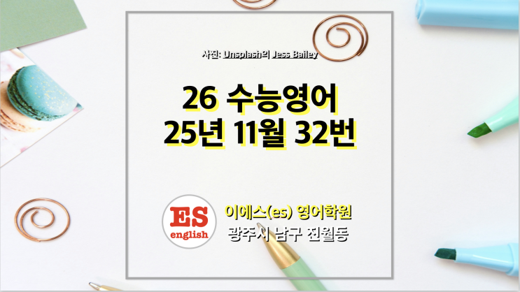 - "단어는 다 아는데 빈칸만 나오면 틀려요." - "해석은 되는데 답이 뭔지 모르겠어요." - 광주 진월동에서 영어를 공부하는 고등학생 여러분, 그리고 고등학교 입학을 앞둔 예비고1 학생 여러분! 혹시 여러분의 고민이 이렇지는 않나요? - 수능 영어, 특히 킬러 문항이라 불리는 '빈칸 추론'은 단순한 번역 실력이 아닙니다. - 출제자의 의도를 꿰뚫는 '논리적 사고력'이 핵심입니다. - 오늘은 많은 학생들이 어려워했던 2026학년도 수능 영어 32번 문제를 통해, ES영어학원만의 차별화된 개인별 맞춤형 '보둠교육'이 어떻게 성적을 바꾸는지 보여드리겠습니다. ✅ 여기 32번 문제를 한번 보....... <img src="https://blogthumb.pstatic.net/MjAyNTEyMTJfMTAw/MDAxNzY1NTE3ODU1NzAz.L-Mpe8XCsBeqXZJSks4ejHN_q2EPEFCAO_dvWSpzt8Ag.IHuaiqSAAXB_XI0d-M619kHwQNi25x2ZxGdaMfDNoVQg.PNG/%BD%BA%C5%A9%B8%B0%BC%A6_2025-12-12_10.36.47.png?type=s3" />