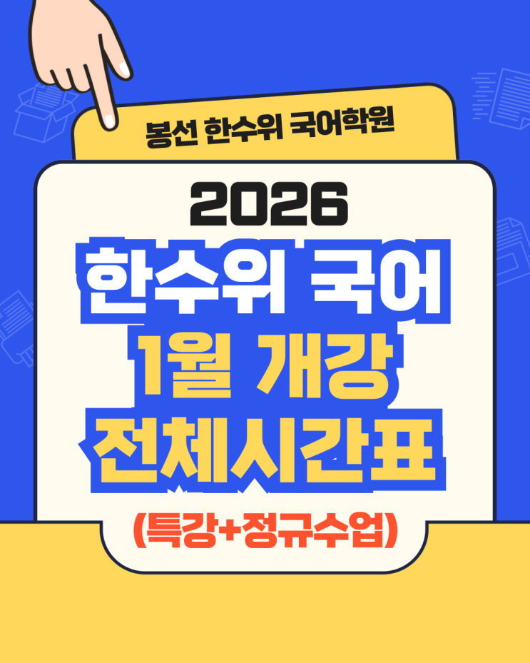봉선동 국어 학원 한수위 국어 전문 학원 제7133호 안녕하세요 봉선동 한수위 국어전문학원입니다. 1월 개강하는 전체 시간표를 안내드립니다. 겨울방학은 한 해 동안 학습한 내용을 정리하고 부족한 부분을 보완하며, 다음 학기를 준비하기에 가-장- 좋은 시기입니다. 특히 국어는 모든 과목의 기초가 되는 만큼, 방학 동안 얼마나 체계적으로 준비하느냐에 따라 새 학기의 성적과 학습 자신감이 크게 달라질 수 있습니다. 겨울방학 특강은 2개월 동안 특정 영역을 집중적으로 학습하는 과정으로, 특강 수강 후 3월부터 정규반 편성을 희망하는 경우 학생의 레벨에 맞는 반으로 배정해 드립니다. 정규 수업은 새롭게 개설된 신규 반과 현재 운영....... <img src="https://blogthumb.pstatic.net/MjAyNTEyMTFfOSAg/MDAxNzY1NDE2MTg5OTE1.sK-AcBnlqwFhUjJcPDDcXqxf0SooWKLJ4kcAUixTikEg.xTHXFuTf7UIfJV3vhhXRF0J9Y11dC5LVL4P_-o5QZWAg.PNG/001.png?type=s3" />