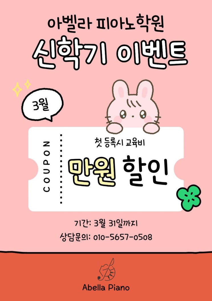 3월 신학기 EVENT 첫 달 교육비 1만원 할인 혜택 안내 안녕하세요~ 아벨라 피아노학원입니다. 설렘 가득한 3월, 새로운 시작의 계절이 찾아왔습니다. 아이들에게 3월은 새로운 담임선생님, 새로운 친구들, 새로운 배움이 시작되는 특별한 달이죠 저희 아벨라 피아노학원에서도 신학기를 맞이하여 작은 응원의 마음을 준비했습니다. ⸻ 신학기 특별 이벤트 안내 ✨ 첫 달 교육비 1만원 할인 대상 : 3월 신규 등록 학생 기간 : 3월 한 달간 등록 시 적용 혜택 : 첫 달 교육비 10,000원 할인 130,000원 >> 120,000원 처음 시작하는 아이들이 부담 없이 음악을 경험해보고 즐겁게 적응할 수 있도록 마련한 이벤트입....... <img src="https://blogthumb.pstatic.net/MjAyNjAzMDJfMTUx/MDAxNzcyNDMzNTk5NDY3.B0H3nOyBjTIyx5BZA_vJmvBo2Lo-MyPcBbi4-82JGXkg.4PuAMi0RKHuF3WJ7K7qHp_r9M4rrKZEY4XODAlgoMYUg.JPEG/1.jpg?type=s3" />