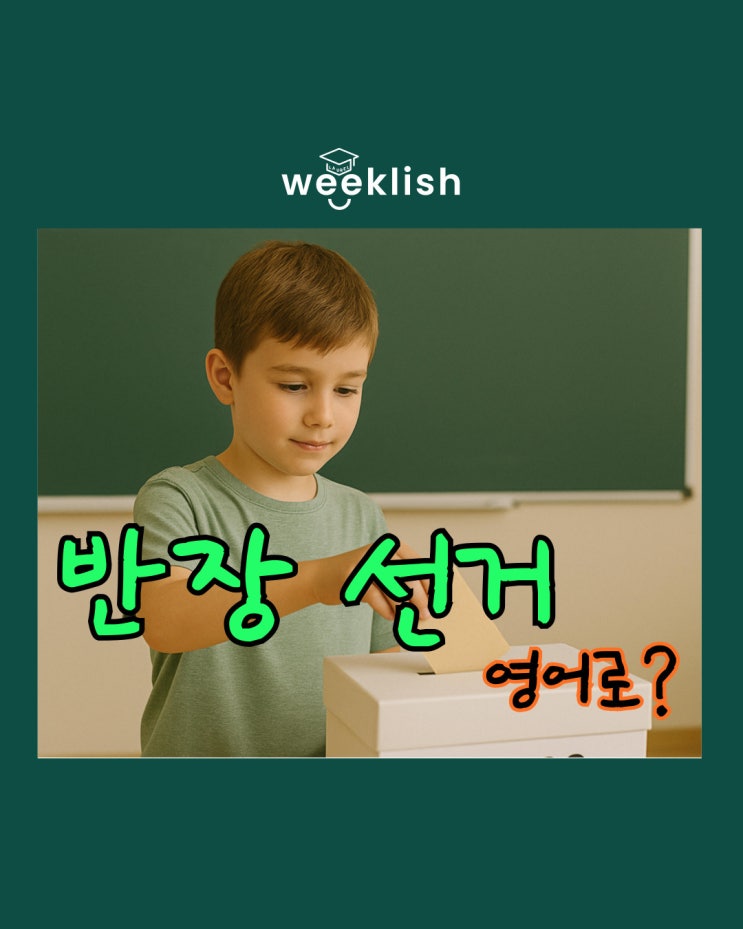 51번째 위클리시 학교에서 빠질 수 없는 이벤트, 바로 반장 선거! 친구들 앞에서 공약을 말하고, 연설도 하고, 투표도 하게 되죠. 그렇다면 “반장 선거”는 영어로 어떻게 말할까요? class leader election? president test? 뭔가 어색하죠? 원어민들은 학교에서 반장을 뽑는 선거를 어떻게 표현할까요? 반장선거 영어로! class president election 정답은 “class president election” 입니다! class president election ️ /klæs ˈprɛzɪdənt ɪˈlɛkʃən/ 반장 선거를 의미하는 표현이에요. class president는 반장 / 학급 대표 그리고 election은 선거 라는 뜻을 가지고 있답니다. 예문으로 살....... <img src="https://blogthumb.pstatic.net/MjAyNjAzMTJfMjYy/MDAxNzczMzA2NDI0MzIw.0TkIyXZ4pCo41D-7Bx2WujF7PHYTwvBYpF4vycWZgfIg.3sGH3X6B_mrap4_JIf50l7_UN3dp5EeEy_4dsxJcDfQg.JPEG/weeklish-49_%BA%B9%BB%E7%BA%BB-_1_-001.jpg?type=s3" />