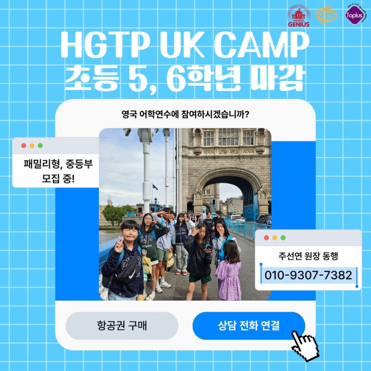 안녕하세요. 토프러스 어학원입니다. 많은 학부모님들의 관심과 문의 속에 진행되었던 HGTP UK CAMP 영국 어학연수 프로그램 초등학교 5학년, 6학년 모집이 마감되었습니다. 보내주신 관심과 성원에 진심으로 감사드립니다. 아이에게 영어 실력과 글로벌 경험을 동시에 키워줄 기회, HGTP UK CAMP 영국 어학연수 프로그램이 곧 모집 마감됩니다. 요즘 많은 학부모님들이 단순한 영어 공부가 아니라 실제로 영어를 사용하고 경험하는 환경을 찾고 계십니다. 이번 HGTP UK CAMP는 영국 현지에서 영어를 배우고 다양한 문화를 경험할 수 있는 영국 어학연수 프로그램입니다. 현재 패밀리형 프로그램 및 중등부 과정은 일부 모집 진행 중입니다....... <img src="https://blogthumb.pstatic.net/MjAyNjAzMTJfMjkx/MDAxNzczMjc5MzY0NDQ3.2QXizrFP03FIj1uQj_MnXHx1yVpHvvOznRI-7LxzKjUg.SjAg4JNKZKKJqK6vd9rKzO2XKcUrKloXl-ncxwnSnhEg.JPEG/HGTP_UK_CAMP_%BF%B5%B1%B9_%BE%EE%C7%D0%BF%AC%BC%F6_%B8%B6%B0%A8.jpg?type=s3" />