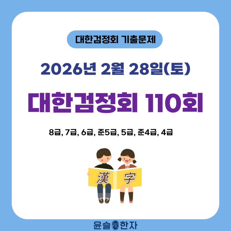 [윤슬한자] 대한검정회 110회 기출문제 공유 (8급, 7급, 6급, 준5급, 5급, 준4급, 4급). 2026년 2월 28일 시험
