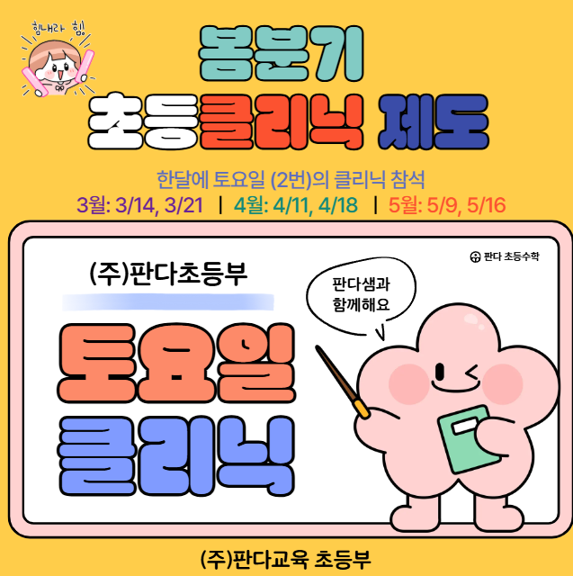 안녕하세요, (주)판다교육 초등부 입니다. 새 학기가 시작되는 설레는 봄, 우리 학생들의 학습 공백을 완벽하게 메우고 실력을 한 단계 도약시킬 '초등 토요 클리닉' 봄 분기 일정이 확정되었습니다. 단순히 문제만 풀고 가는 시간이 아닙니다. 철저한 데이터 분석과 개별 맞춤 관리를 통해, 우리 학생이 무엇을 알고 무엇을 모르는지 정확히 파악하여 확실한 '내 실력'으로 만드는 시간입니다. [2026 초등 3월 진단평가 실시] 3월 14일(토), 대망의 '진단평가' 실시 봄 분기 클리닉의 시작은 정확한 진단에서 출발합니다. 3월 14일에는 전 학년 진단평가가 진행됩니다. (1달에 2번 판다 초등학생들은 토요일 2회....... <img src="https://blogthumb.pstatic.net/MjAyNjAzMDZfMjgz/MDAxNzcyNzgxMDMwNTk0.xWSisnUoISCEBwo28W_vD5HJBoBDv6gAar4kap9OeXQg.FS0IEK3Vsmwvs9uqGdxcdCDuCb5VUA_e6SV8uHzjj2Ig.PNG/image.png?type=s3" />