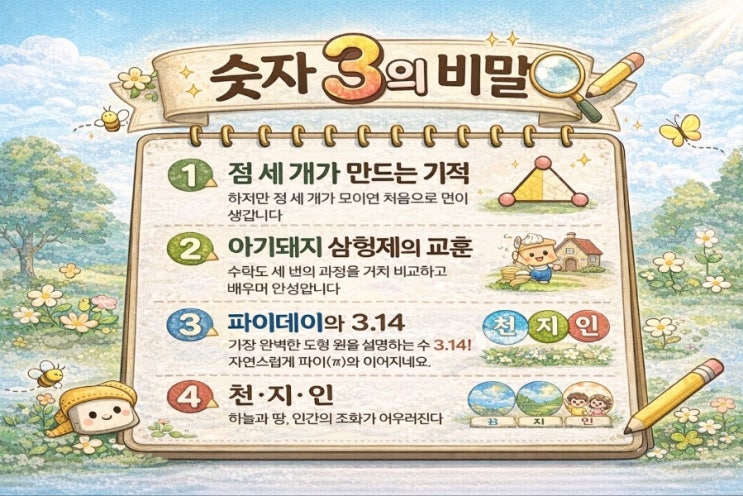 안녕하세요 소하동 넘버원 '더잘영수학원'입니다 엊그제가 2026년 시작이었던것 같은데 벌써 새학기의 시작 3월이네요 시간 참 빠릅니다 1월과 2월이 겨울 끝자락에서 숨을 고르는 시간이었다면, 3월은 만물이 기지개를 켜는 달입니다 새 학년, 새 친구, 새 교과서, “이제 진짜 시작이구나” 하는 마음이 드는 시기죠 그런데 3월이 왜 ‘3월’일까요? 우연일까요? 아니요! 숫자 '3'은 수학적으로 보면 꽤 의미 있는 숫자랍니다 점 세 개가 만드는 기적 그림 속 삼각형을 보셨나요? 점 하나는 그냥 ‘위치’입니다(0차원), 점 두 개는 ‘선’이 됩니다(1차원), 하지만 점 세 개가 모이면 처음으로 ‘면’이 생깁니....... <img src="https://blogthumb.pstatic.net/MjAyNjAzMDFfMjI0/MDAxNzcyMzQ4MTQwMzc3.ntwkX5bXmhzz_9ZjSPXukMvtaK3hMC4ppzMva-XO9uMg.5_RNdZyX7NUztZKpDMU01j-D2dKvfJzpFYyskbo_QoQg.JPEG/900%A3%DF1772348128352.jpg?type=s3" />