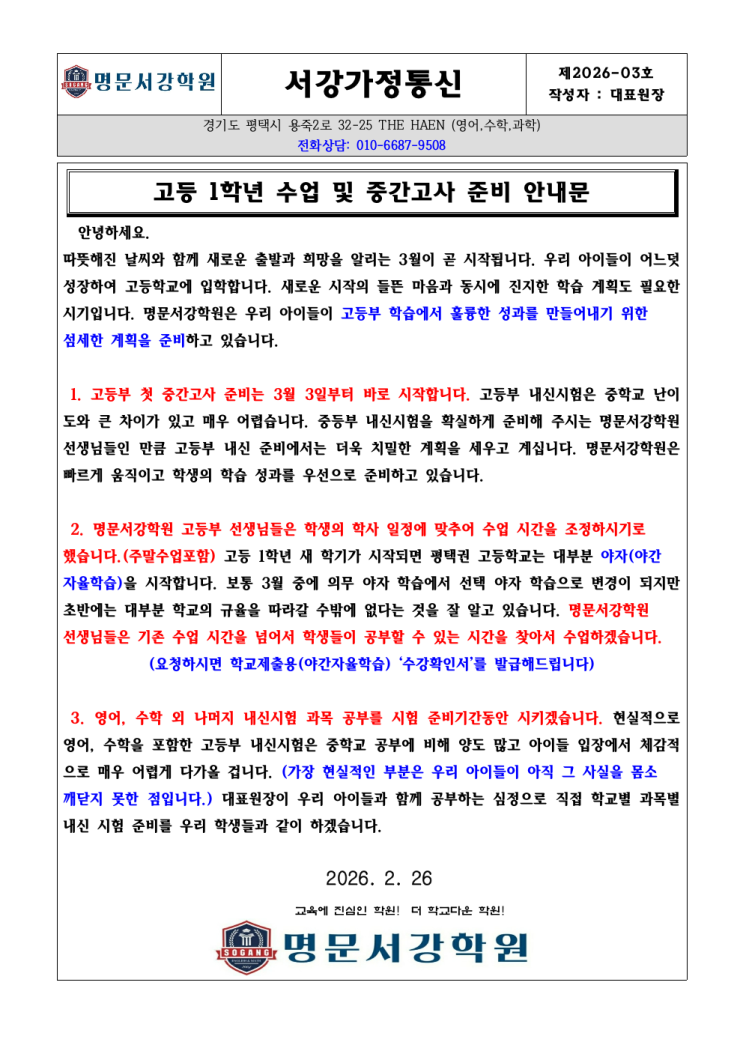 고등 1학년 수업 및 첫 중간고사 준비 안내문