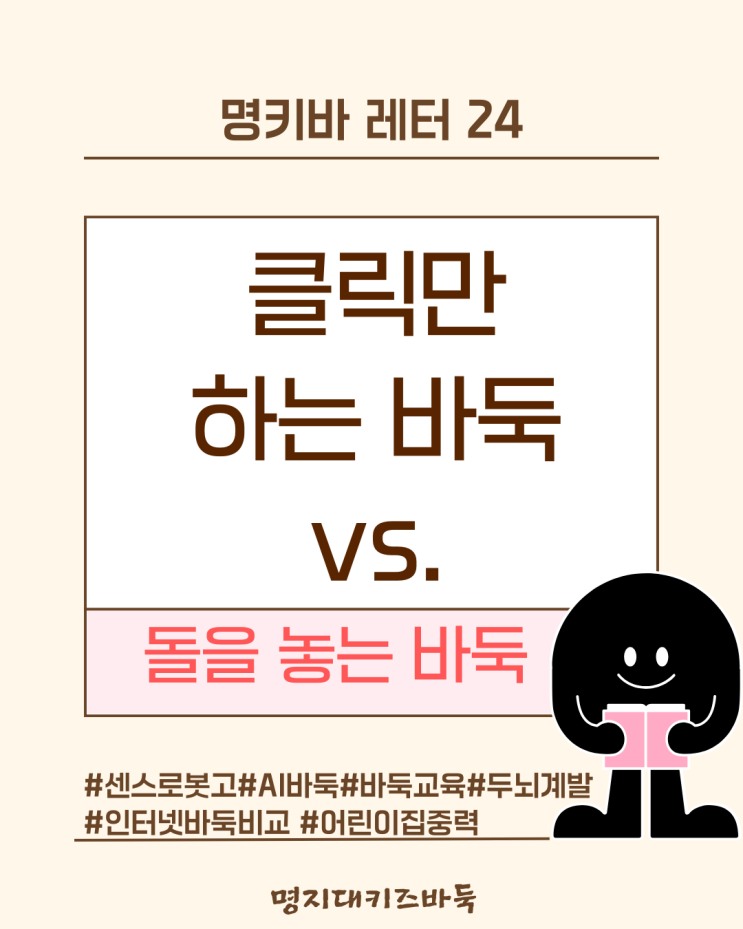 안녕하세요, 갈매바둑학원 명지대키즈바둑입니다. 클릭은 1초면 끝나지만, 수읽기는 1분을 고민해야 합니다. 1. "우리 아이도 인터넷 바둑 두는데, 학원 로봇은 뭐가 다른가요?" 요즘은 스마트폰이나 태블릿으로 어디서든 바둑을 둘 수 있는 시대입니다. 하지만 바둑 전문가들과 뇌 과학자들이 입을 모아 말하는 차이점이 있습니다. 바로 '실재감'과 '감각의 자극'입니다. 2. 뇌를 깨우는 손끝의 감각 (Tactile Learning) 인터넷 바둑: 마우스 클릭이나 화면 터치로 끝납니다. 평면적인 자극에 불과하죠. 센스로봇고: 아이가 바둑알을 직접 집어 판 위에 놓을 때 발생하는 촉감, 소리, 시각적 잔상은 뇌의 전두엽....... <img src="https://blogthumb.pstatic.net/MjAyNjAyMjdfMTQz/MDAxNzcyMTg1MjQ1Nzk2.vje-HhACNBwTrJxkfg4SSWvWAnREEZ5MMFKBwpK3-l4g.t9hcj8rBK8Q62GnV9-ZgNMwl_KvjDgh1TcHzYYDNTesg.PNG/1.png?type=s3" />