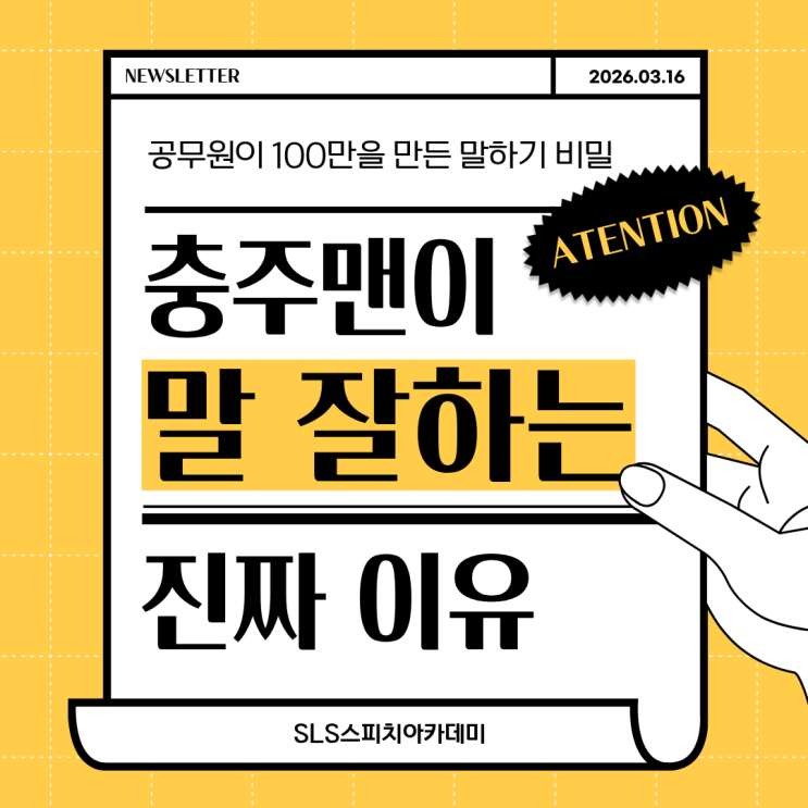 안녕하세요! SLS스피치아카데미입니다. 오늘은 재밌는 주제를 가져왔습니다. 2026년 3월, 한 남자가 유튜브 채널을 개설했습니다. 개설 3일 만에 구독자 100만 명. 영상 하나에 수백만 조회수. 그는 특별한 외모도, 화려한 언변도 없습니다. 그런데 왜 대한민국이 그의 말에 열광할까요? 충주맨 김선태의 말하기를 분석해 보겠습니다. 그의 말 속에는 우리가 배워야 할 핵심 스피치 기술 5가지가 담겨 있습니다. 기술 1. "진지함"을 무기로 쓴다 — 포커페이스 스피치 충주맨의 가장 독보적인 특기는 바로 "진지한 얼굴로 웃긴 말을 한다" 는 것입니다. 스피치에서 이것을 포커페이스 기법(Deadpan Delivery) 이라고 부릅니....... <img src="https://blogthumb.pstatic.net/MjAyNjAzMTZfMTQ4/MDAxNzczNjQwMDM5NzUw.NHm2yUQPBwMxq6zOjjId1IE7XMtU4c_Pt2Qtw7bnGgQg.zcUcVRV_Rgq9YURdkW1zzRilUmSwZiJEz_6KdJr-eoIg.PNG/%C1%A6%B8%F1%C0%BB_%C0%D4%B7%C2%C7%D8%C1%D6%BC%BC%BF%E4._%281%29.png?type=s3" />