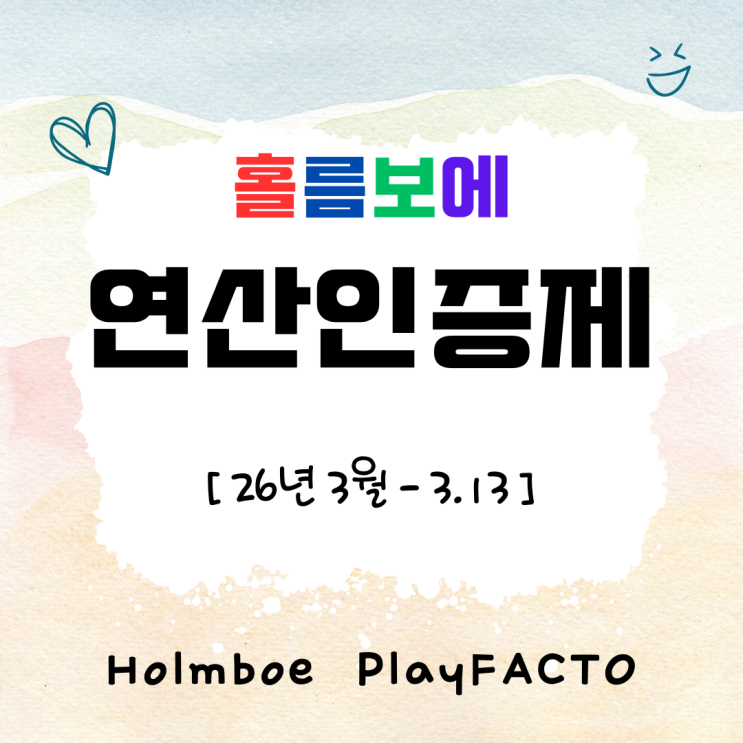 변화의 3월, 흔들림 없이 이어지는 연산의 기본기 안녕하세요! 놀면서 배우는 수학, 홀름보에 플레이팩토입니다! 이번 달은 여러 환경적인 변화가 겹치며 연산인증제 도전이 다소 주춤한 모습도 있었습니다. 먼저 플레이팩토 본사에서 주최하는 ‘제2회 전국 사고력 연산 EGG 마스터즈’ 준비 분위기가 학원 전체에 형성되면서, 아이들의 학습 에너지가 대회 대비 쪽으로 많이 집중되었습니다. 또한 이사로 인해 학원을 떠난 친구들도 있었고, 3월에 새롭게 입학한 신입생들은 아직 연산인증제를 바로 시작하지 않은 상태라 평소보다 도전자 수가 적게 느껴지는 달이었습니다. 하지만 이러한 변화 속에서도 꾸준히 도전을 이어 간 친구들이 있었....... <img src="https://blogthumb.pstatic.net/MjAyNjAzMTZfMTg2/MDAxNzczNjQ5MTEwNjM2._DEAMEWHvqoq-HJRynYcZpbseLpPnx-j1HRLb2ygroUg.-1JCi7YHG8aqelTHZ2s1iGlSGOOBZGD2Q4fHLgDWq04g.PNG/%BD%E6%B3%D7%C0%CF_%BC%F6%BE%F7%281%B0%FC%29.png?type=s3" />