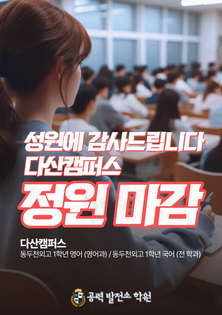 안녕하세요, 동두천외고 내신 전문 공력발전소학원입니다. 다산과 일산에 마감 과목이 있어 공지드립니다. 성원에 힘입어 동두천외고 1학년 학생들이 수강하는 일부 과목이 마감되었습니다. 저희는 학원은 마감 과목의 경우 매달 25-27일 사이에 기존 수강생 등록 이후 28-30 사이에 신규생 등록을 받습니다. 마감된 과목 수강을 원하는 학생은 미리 예약을 부탁드립니다. 예약 순서대로 연락을 드립니다. 더불어 마감 임박 과목은 3~5명 이내로 정원이 마감될 과목이며, 미리 연락주셔야 좋습니다. 한 두명은 금방 채워지므로 서둘러 주세요. 다산캠퍼스: 1학년 영어과 영어, 국어 마감 1학년 비영어과 영어, 수학 상위권, 일본어 마감 임박 다....... <img src="https://blogthumb.pstatic.net/MjAyNjAzMTZfMjAg/MDAxNzczNjI1NDg5MTMx.s7Z7V0orYwtNjxIQeniOxu3oie-25n_AyXt3UwEpicgg.2heY6cj8oUHd9uI8XSYBvc1gDLdwzjppZ_qq4l_LIeMg.JPEG/%C1%A4%BF%F8%B8%B6%B0%A8%2C_%B8%B6%B0%A8%C0%D3%B9%DA%2C_%B5%BF%BF%DC%B0%ED_%BF%C2%B6%F3%C0%CE%B9%DD-01.jpg?type=s3" />