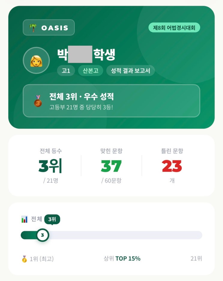 산본고 다니는 형이 오아시스에 다니는 바람에 어머님의 신뢰 가득 프리 패스로 오아시스 중3 반에 1년 전에 들어온 궁내중 박 OO 학생 스토리텔링 성장 풀 스토리. 이번에는 성장 스토리들을 좀 이야기해 보고자 합니다. 우선 산본고1 박 OO 학생. 제8회 오아시스어법경시대회 3등 축하합니다. 이로써 산본고내신에서 상당한 경쟁력을 갖췄다 생각합니다. 산본 지역에서 고등전문으로 10년간 군포 관내 학교들의 내신대비를 했다면 매년 어떤 경험을 할까요? 각 중등부 영어학원 출신들이 총집합합니다. XX어학원, XX어학원, XX영어학원 최상반출신, 외고 준비하던 아이, 공부방, 과외, 독학 등 다양한 환경에서 공부하던 다양한 실력대의 아이....... <img src="https://blogthumb.pstatic.net/MjAyNjAzMDJfMTAg/MDAxNzcyMzg3NDg5MDE1.F1HbKe0rNM9DUbDQjVkfmQFmie2rsFd68Gn-r7FEo2sg.1wZENsqM8QgXJyPENASNnTxBGSRonOO6qscxS5UAXAsg.JPEG/KakaoTalk_20260302_022120628.jpg?type=s3" />