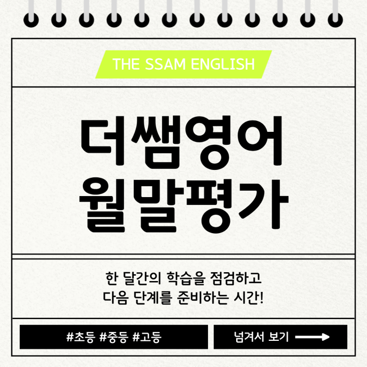 안녕하세요, 더쌤영어 학원입니다. 아이가 학원에서 잘 따라가고 있는지, 속도는 잘 맞는지, 궁금해하시는 부모님들이 많습니다. 저희 더쌤영어 학원에서는 이런 궁금증을 해소시켜 드리기 위해 월말평가를 진행하고 있는데요. 지금부터 더쌤영어 월말평가에 대해 함께 알아보겠습니다! 월말 평가란? 더쌤영어 학원에서 재원생을 대상으로 매월 말 실시하는 정기 평가입니다. 수업에서 배운 단어/문법/독해 내용을 중심으로, 학생들의 이해도와 학습 성취도를 점검합니다. ✔ 한 달 동안 배운 내용을 얼마나 정확하게 이해했는지 ✔ 어떤 부분이 잘 이해하고 있고, 어떤 부분은 보완이 필요한지 를 확인하는 학습 진단 과정으로, 점수보다 아이의....... <img src="https://blogthumb.pstatic.net/MjAyNjAyMDdfMTA5/MDAxNzcwNDM3NTg0OTk1.HzOcePkjqkJbZP55djvUx5GPhraq2qswI0PP7Di0DBIg.CRKTTrcs5Ys-XJXsaG5CfSpD4JIBYNKrDjK8-XowhbAg.PNG/%C1%A6%B8%F1%C0%BB_%C0%D4%B7%C2%C7%D8%C1%D6%BC%BC%BF%E4._%2816%29.png?type=s3" />