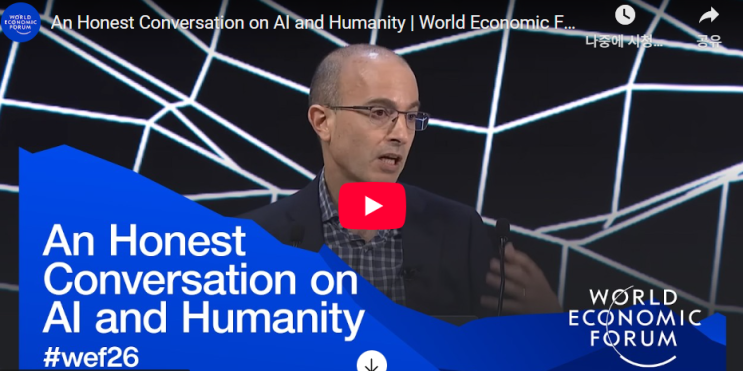 안녕하세요, 성수동 영어교육 전문가 모니카쌤이에요. 아이들을 매일 만나고 가르치고, AI에 대한 발전을 체감하면서, 기대보다는 우려하는 마음이 커서 최근 AI에 대한 세계 석학 들의 강의를 듣고 있어요. 마침, 최근 2026 다보스 포럼 주제 중의 하나가 AI이고 AI의 개발자들, 학자들의 AI에 대한 강의가 있어서 하나씩 듣고 있어요. 인간의 과거, 현재, 미래를 큰 관점으로 해석하는 히브리 대학의 유발하라리 교수의 강의는 현재의 관점이 아닌 인간 역사에 비추어 하시는 거시적 관점의 강의여서 AI에 대한 전망과 통찰력이 매우 thorough 했어요. 영어발음도 쉽고 clear해서 적극 추천합니다. 요점을 정리해서 공유해요. https://www.yout....... <img src="https://blogthumb.pstatic.net/MjAyNjAyMDhfMTg4/MDAxNzcwNTQ1NzQzOTY5.fvJ7oR9OCRJ90THzsZ2GHEYfPklt3A3lY2PP3awL6Ggg.JEtQUIpoodqsH8JiRIBoe2-nn2GQsi6dTtYljCmnqUsg.PNG/image.png?type=s3" />