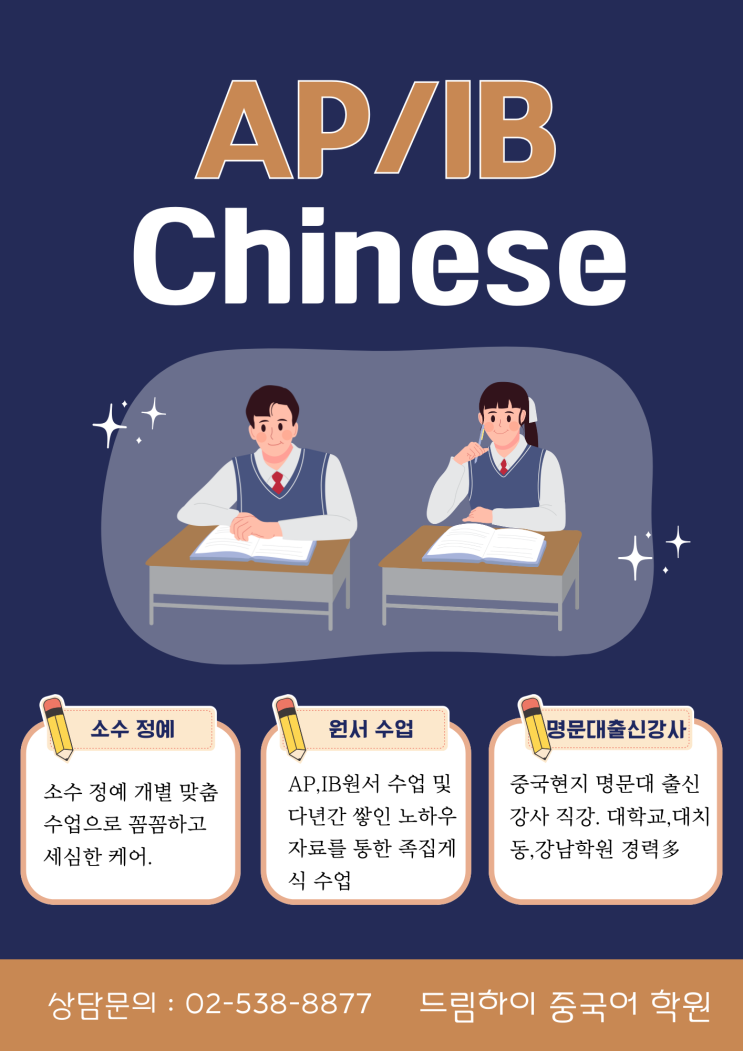 결과는 거짓말하지 않습니다. 체계적인 전략 수업 + 실전 대비 시스템으로 만점 달성! AP Chinese, 혼자 준비하지 마세요. 드림하이에서 함께하면 5점이 현실이 됩니다. 다음 주인공은 바로 당신입니다. 드림하이중국어학원만의 차별화 “중국어는 처음부터 전략적으로 접근해야 합니다.” AP Chinese, 내신과는 전혀 다른 문제 유형과 접근 방식! 드림하이는 수많은 AP 만점자를 배출한 전문 프로그램과 지도 시스템을 보유하고 있습니다. ✔️ 듣기/독해/작문/말하기 영역별 집중 훈련 ✔️ 매 시간 개별 피드백 & 실전 모의고사 ✔️ 단기 완성 가능! (10회 집중 프로그램 운영) 지금 여름 방학이 최 적기입니다. 1대1/....... <img src="https://blogthumb.pstatic.net/MjAyNjAzMDRfMTgz/MDAxNzcyNjExODk1MzEx.dlix13rFbfPPLEcRnDwH3kkKTfxpAuRIHdgAbV2Yolgg.vHx2xbHM6GGrdOgeZiZZHKCpg0T2GHSN5Z-PeOpPtY8g.PNG/KakaoTalk_20260304_170251254_02.png?type=s3" />