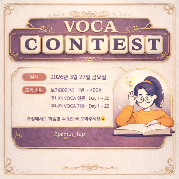 오늘은 3월 27일에 진행되는 Voca Contest를 소개해 드리려고 합니다. 파머스 원업 초등부에서는 매주 금요일마다 단어 학습과 테스트를 꾸준히 진행하고 있는데요. 이번 Voca Contest에서는 보카800(상), 주니어 Voca 입문·기본·실력 교재 범위 중에서 총 400단어를 시험 보게 됩니다. 단순히 시험을 위한 암기가 아니라, 아이들이 어휘력을 탄탄하게 쌓고 스스로 성취감을 느낄 수 있도록 준비하고 있습니다. 파머스원업 아이들도 좋은 결과와 소중한 경험을 위해 요즘 더욱 열심히 단어를 암기하며 준비하고 있답니다. ✏️ 3월 27일 Voca Contest에서 아이들이 그동안의 노력만큼 좋은 결과와 자신감을 얻는 시간이 되기를 기대합니다! 항....... <img src="https://blogthumb.pstatic.net/MjAyNjAzMDVfMjk0/MDAxNzcyNjg3NDMyNTQz.v0kMAvZUsTVVo3haJEe2gZtmf9uYyFwL6YAPSHwbpWog.cLjfSh59_17pUXquemcU4R7Xhza0rhNX_SuiSwPTdw0g.PNG/1212.png?type=s3" />