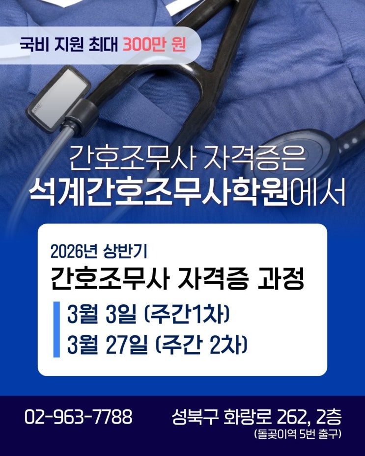 안녕하세요 석계간호조무사학원입니다! 아이를 키우고 가족을 돌보느라 나의 시간을 잠시 내려놓았던 날들. 어느 정도 여유가 생기고 나면 문득 이런 생각이 듭니다. “이제는 나를 위해 살아보고 싶다.” 하지만 오랜 공백 끝에 다시 일을 시작하는 일은 쉽지 않습니다. 경력이 끊긴 현실, 특별한 자격증이 없다는 불안감 때문에 망설이게 됩니다. 이런 분들께 현실적인 대안이 되어주는 자격증이 바로 간호조무사입니다. 국가자격증으로 만드는 안정적인 미래 간호조무사는 보건의료 분야의 국가자격증으로, 정해진 이론 수업과 병원 실습 과정을 이수한 뒤 국가시험에 합격하면 취득할 수 있습니다. 자격증 취득 후에는 내과, 정형외과, 소아....... <img src="https://blogthumb.pstatic.net/MjAyNjAyMjdfMjM1/MDAxNzcyMTUwMjQ0NTc5.Z8xDTvyNXvPJRbHvwwzccC0gGWi4HXkaUy5MoUlI_Fcg.2Ew528lUrxvVwj1OhZvh61pizVSU2YIkOI30p0gzFTwg.JPEG/%B0%A3%C8%A3%C1%B6%B9%AB%BB%E7%B0%FA%C1%A4_26_%BB%F3%B9%DD%B1%E2.jpg?type=s3" />
