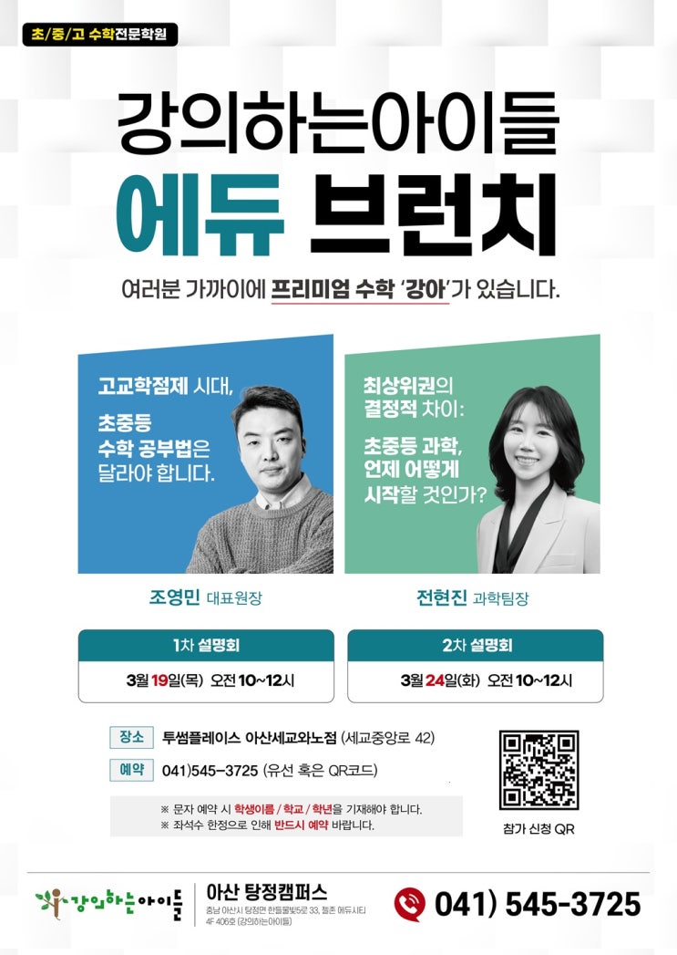 안녕하세요. 강아하이퍼온 에듀 (강의하는 아이들) 입니다. 따뜻한 햇살과 함께 봄기운이 조금씩 느껴지는 3월입니다. 새학기를 맞아 학부모님들과 함께 아이들의 학습 방향을 나누는 26' 강의하는 아이들 정기 설명회 '에듀브런치' 를 준비했습니다. 이번 에듀브런치에서는 수학 학습 방향뿐만 아니라 최상위권을 결정짓는 차이! 과학적 사고력의 기초를 만드는 저희 강아 과학 수업에 대한 내용도 함께 소개해 드릴 예정입니다. 수학과 과학을 연결하는 사고력 학습이 어떻게 아이들의 실력 차이를 만들어내는지, 그리고 학원에서 어떤 방식으로 지도하고 있는지 자세히 안내드리고자 합니다. 따뜻한 커피와 함께 학부모님들과....... <img src="https://blogthumb.pstatic.net/MjAyNjAzMDZfMTg0/MDAxNzcyNzgwODkxMDQ1.r0WGbEXiPymVIC0KjwkMWE_jBk_WmoeH7tjEjFwwPSYg.PtAStTz4oHF3hQX5C4HsUm700i2lq_rN9Xeq7-j2G54g.JPEG/%BC%B3%B8%ED%C8%B8%C6%F7%BD%BA%C5%CD.jpg?type=s3" />