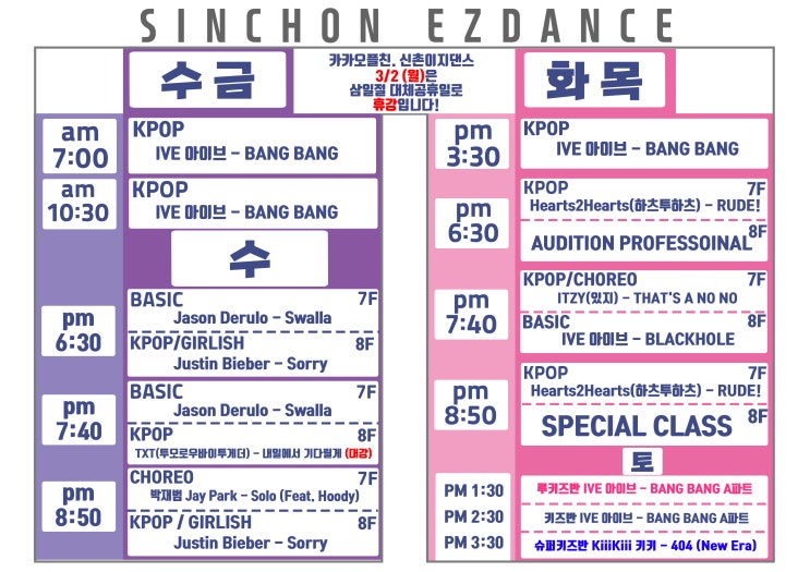 26년 3월 첫째주 수업 곡명 #홍대댄스학원 #이지댄스신촌점 #하츠투하츠 #rude ! #방송댄스 배우기 안녕하세요! #랭키닷컴 1위 #댄스학원 #신촌이지댄스 입니다 :) 어느덧 새학기의 시작과 함께 3월이 시작되었는데요-! 산뜻한 봄을 맞으며 저희 #이지댄스 에서 산뜻하게 준비한 3월 첫째주 수업 곡명을 공개합니다 !-! #최신케이팝 안무는 역시 이지댄스신촌점!! 요즘 제일 핫한 #아이브 #ive 의 #뱅뱅 #bangbang 부터, 아이브의 #blackhole #블랙홀 , #hearts2hearts #하투하 의 #루드 rude! , 천천히 역주행중인 #txt #투모로우바이투게더 #투바투 의 #내일에서기다릴게 , 독기 품고 컴백한 #ITZY #있지 의 #thatsanono #댓츠어노노 , #릴스 ,....... <img src="https://blogthumb.pstatic.net/MjAyNjAyMjhfMTc5/MDAxNzcyMjUzNDAzMDY1.tKtXtIPy-lwJHjrd04TG0jO9x6phywEObbvVrfiuU4wg._snBaCyIGNWdwQN4C5-FAR5kNZuaAhXJoudLhMcCtrQg.JPEG/26%B3%E2-3%BF%F9-%C3%B9%C2%B0%C1%D6-%BC%F6%BE%F7-%B0%EE%B8%ED.jpg?type=s3" />