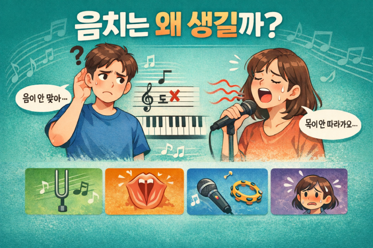 안녕하세요 순천실용음악학원 모드실용음악학원 입니다 :D 노래를 부를 때 음정이 잘 맞지 않아서 스스로를 ‘음치’라고 생각하는 분들이 꽤 많습니다 그렇다면 과연 음치는 왜 생기는 걸까요? 정말 타고난 능력의 차이일까요? 오늘은 보컬 레슨을 하면서 많이 받는 질문인 “음치는 왜 생길까?”에 대해 쉽게 설명해 드리려고 합니다 1️⃣ 음정 인식 능력 부족 노래를 잘 부르려면 먼저 소리를 정확하게 듣고 인식하는 능력이 필요합니다 어떤 사람들은 음 높이 차이를 정확하게 구분하지 못하기 때문에 들리는 음과 실제로 내는 음이 달라집니다 예를 들어, 피아노 도(C)를 들었는데 본인은 맞게 냈다고 생각하지만 실제로는 다른 음을 내고....... <img src="https://blogthumb.pstatic.net/MjAyNjAzMTNfNTQg/MDAxNzczMzc4Mzk1ODg5.n96E3kD9z8YZWNwr88C7Gb71fj8Ni-EGjFmABkiuWb0g.OOY9zvL-pisvw91EsFr5F6ncP_eoBHVl3QtCT33e0YUg.PNG/ChatGPT_Image_2026%B3%E2_3%BF%F9_13%C0%CF_%BF%C0%C8%C4_02_01_56.png?type=s3" />