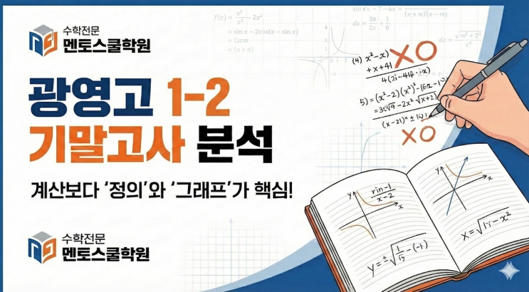 안녕하세요. 수학전문 멘토스쿨 낭만쌤입니다. 지난 12월 10일 치러진 광영고등학교 1학년 2학기 기말고사(공통수학2), 우리 학생들 어떻게 봤나요? 새로운 교육과정(2022 개정)이 적용된 첫 해라 걱정도 많았겠지만, 결과를 분석해 보니 **"역시 기본에 충실하고, 멘토스쿨의 적중 자료를 믿고 따른 학생들이 승리했다"**는 결론이 나옵니다. 오늘은 이번 광영고 시험의 총평과 더불어, 소름 돋는 멘토스쿨 예상문제 적중 사례, 그리고 1등급을 결정지은 **킬러 문항(서술형)**까지 완벽하게 해부해 드립니다. 1. 총평: "중상(中上) 난이도, 그래프가 승부를 갈랐다" 난이도: ★★★☆☆ (중 ~ 중상) 특이사항: 초중반 문항....... <img src="https://blogthumb.pstatic.net/MjAyNTEyMTNfMTYw/MDAxNzY1NTUyMDM4Mzc1.vAhg_2324stG9AV67hk31kc-Pssy_60o84XXf6XOAIYg.9PvovJPHEfiJJ8VLDGQdMOgyY7TKNAHK5e8843IzProg.PNG/Gemini_Generated_Image_dmzn47dmzn47dmzn.png?type=s3" />